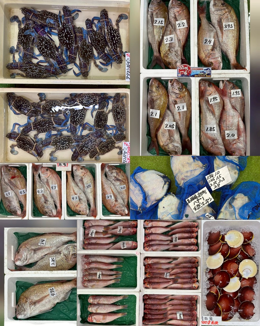 ■底曳ホウボウ、エビスダイ、アオハタ、キジハタ、チカメキントキ、マダイ、マダイ(大)、アマダイ、どんちっちノドグロ、アナゴ■定置網コシナガ、ヨコスジフエダイ、ウスバハギ、スギ(片身OK)、クロダイ、カンパチ(神経〆)、ヒラマサ(神経〆)スズキ(神経〆)、カマス、オキアジ、マアジ■その他月日貝、タイワンガザミスッポン