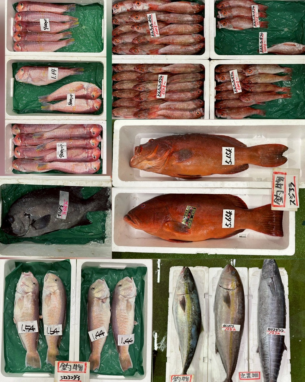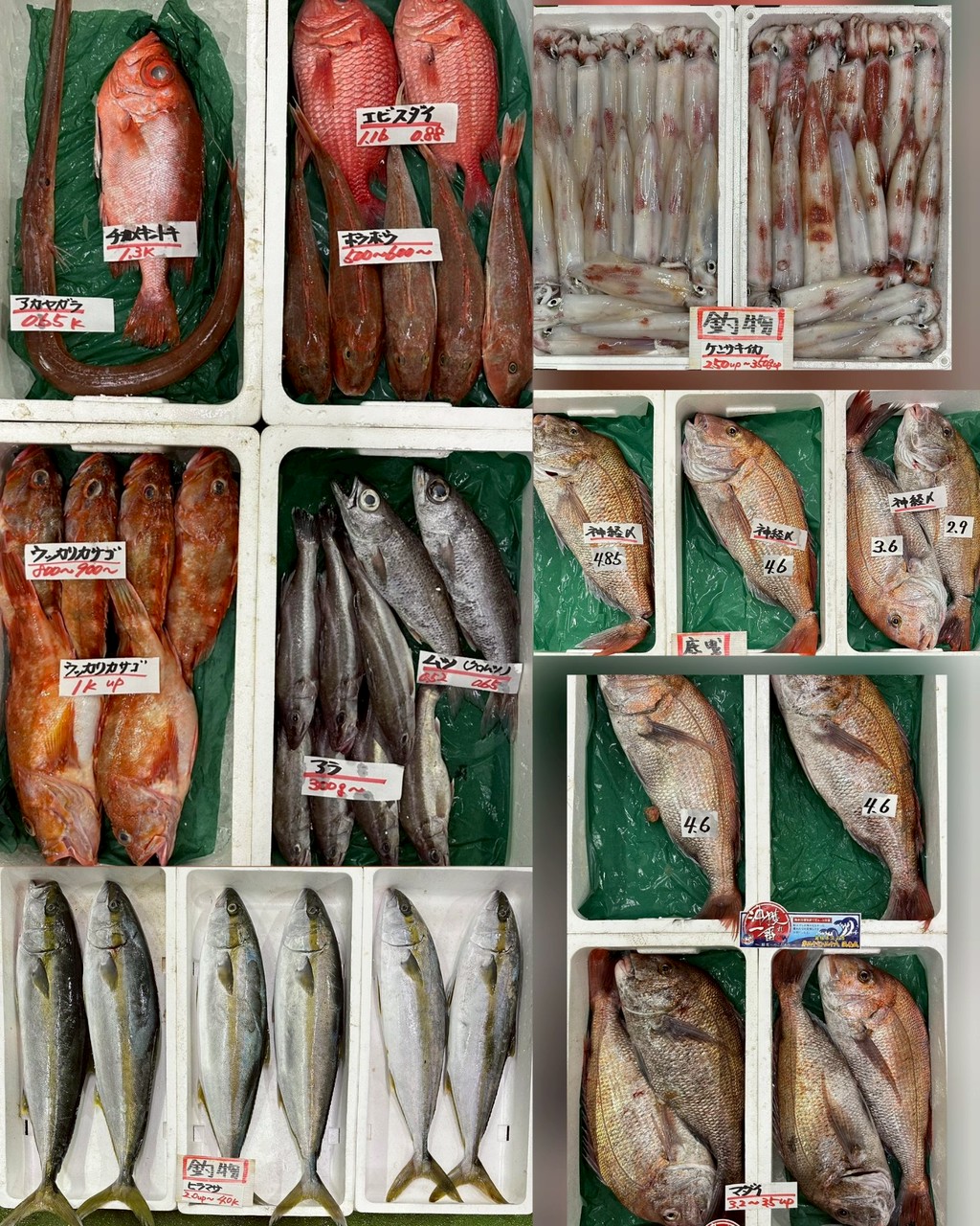 ■底曳どんちっちノドグロ、アマダイ、マダイ(沖獲)、エビスダイ、ホウボウ、チカメキントキ、アカヤガラ、クロムツ、アラ、ウッカリカサゴ■定置網カマスサワラ(片身OK)、カンパチ(片身OK)■釣物ブリ、シロアマダイ、イシダイ、スジアラ、ケンサキイカ、ヒラマサ