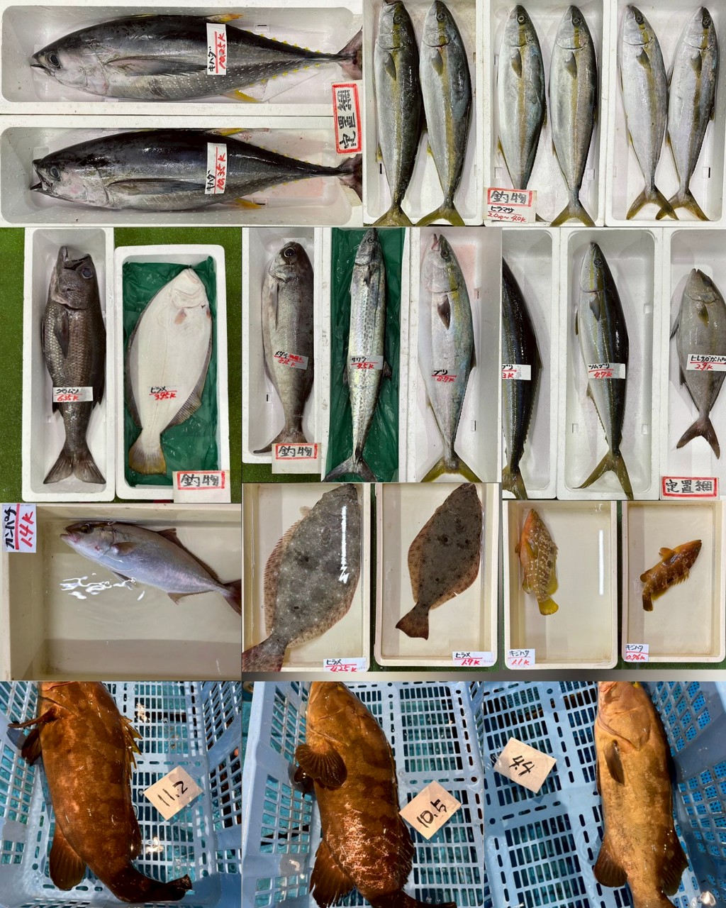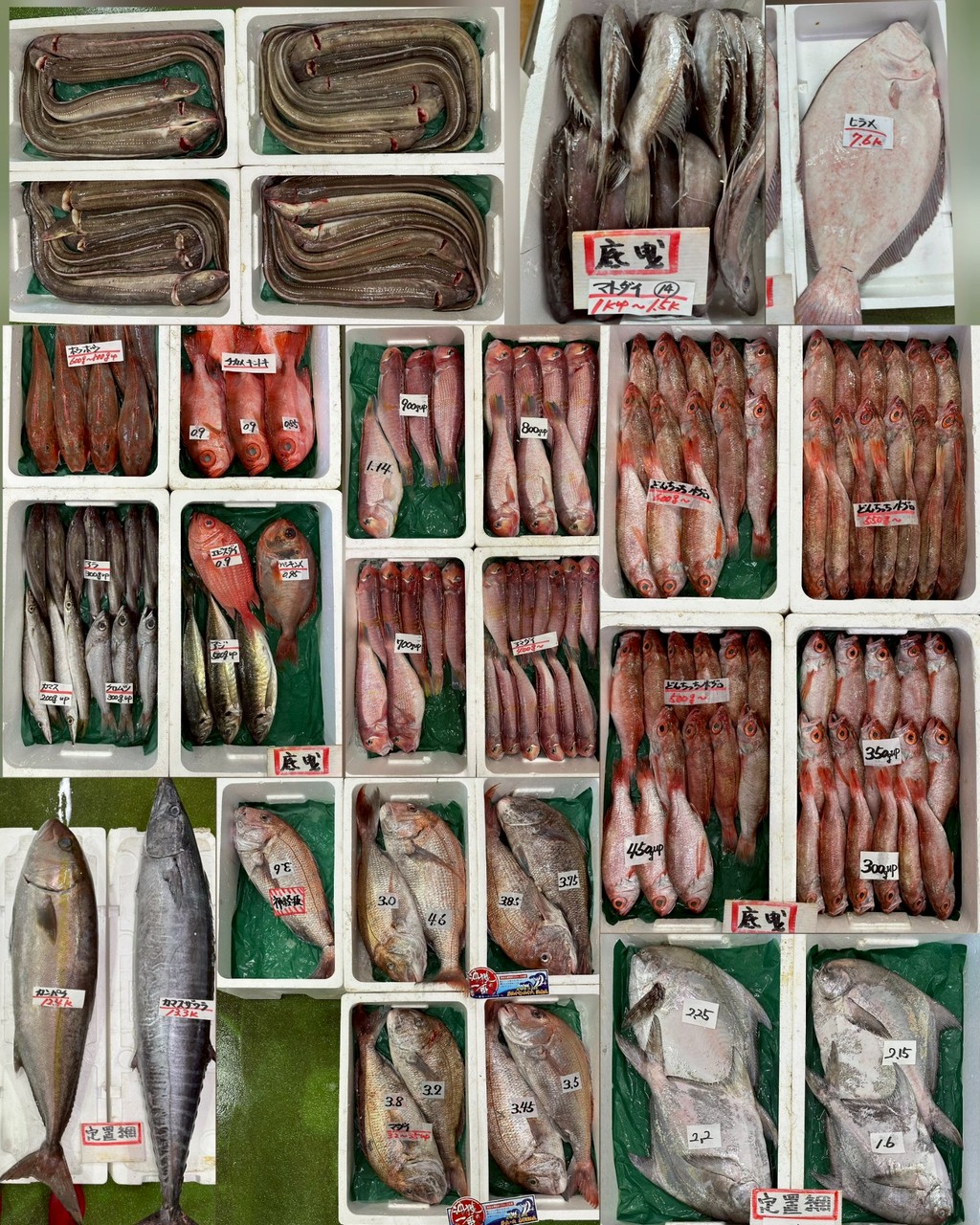 ■底曳どんちっちノドグロ、アマダイ、タイ(沖獲)、タイ(神経〆)、ヒラメ、マトダイ、アナゴ、チカメキントキ、ホウボウ、ハシキンメ、エビスダイ、アジ、アラ、クロムツ、カマス■定置網マナガツオ、キハダ(片身OK)、カンパチ(片身OK)、カマスサワラ(片身OK)、ツムブリ、ヒレナガカンパチ(太)■釣物ブリ、サワラ、メダイ、ヒラメ、クロムツ、ヒラマサ(特価)■釣活魚クエ、キジハタ、ヒラメ、カンパチ