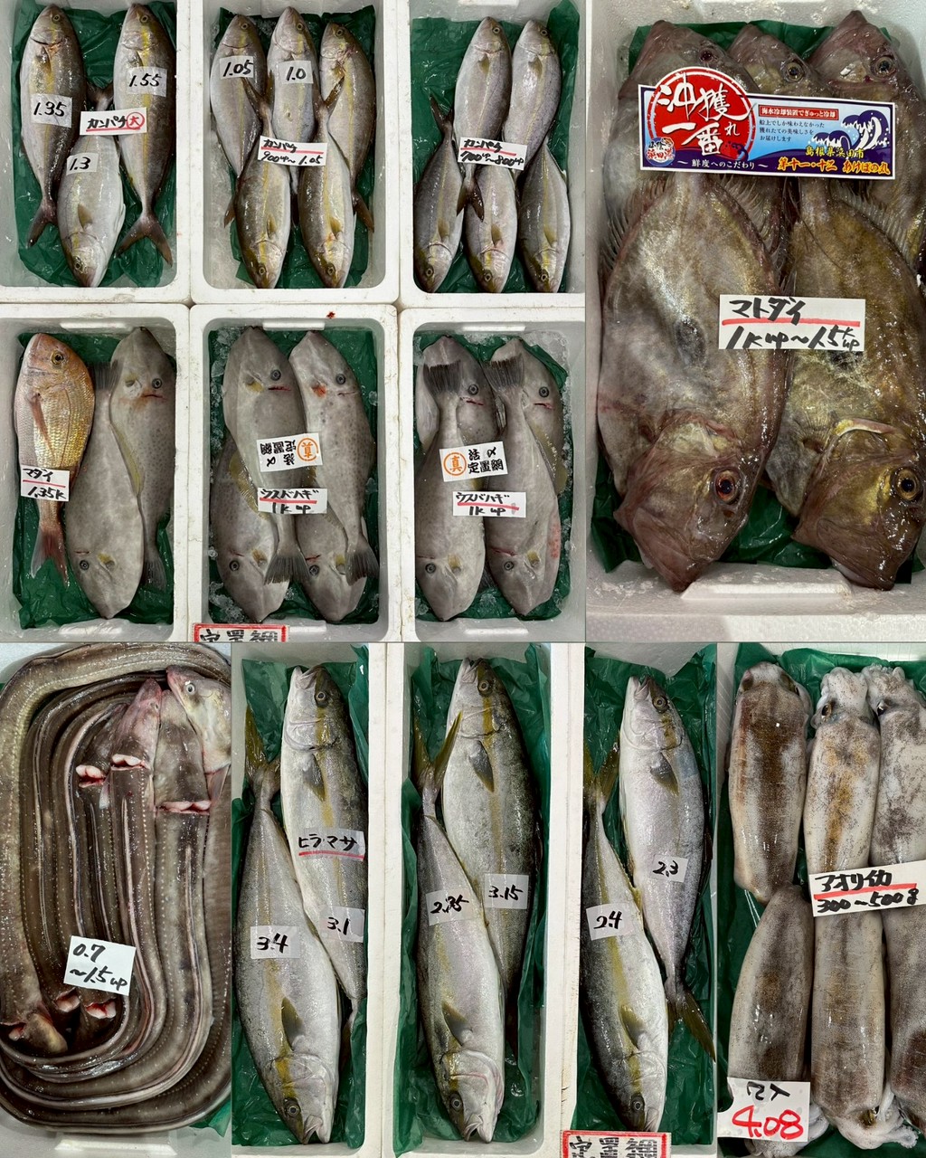カンパチ、ウスバハギ、マダイ、ツムブリ、コシナガ、スズキ、サワラ、ヒラマサ、アオリイカ