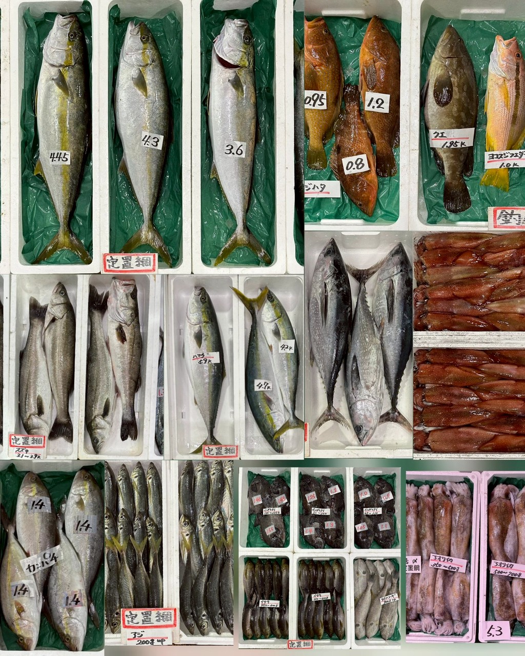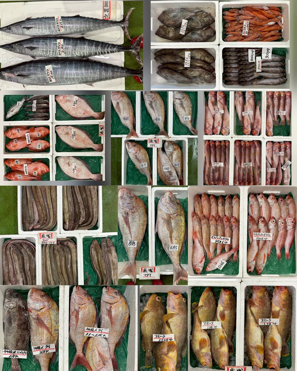 ■底曳アマダイ、どんちっちノドグロ、タイ、アラ、チカメキントキ、ヒラメ、マトダイ、ベニテグリ、アナゴ、アオハタ、マダイ(神経〆)、コショウダイ(神経〆)■定置網カマスサワラ、ハマチ、ブリ、コシナガ、イシガキダイ、ウスバハギ、イサキ、カンパチ、アジ、スズキ、サワラ、アオリイカ、ヒラマサ■釣物ヨコシマフエダイ、クエ、キジハタ、ケンサキイカ