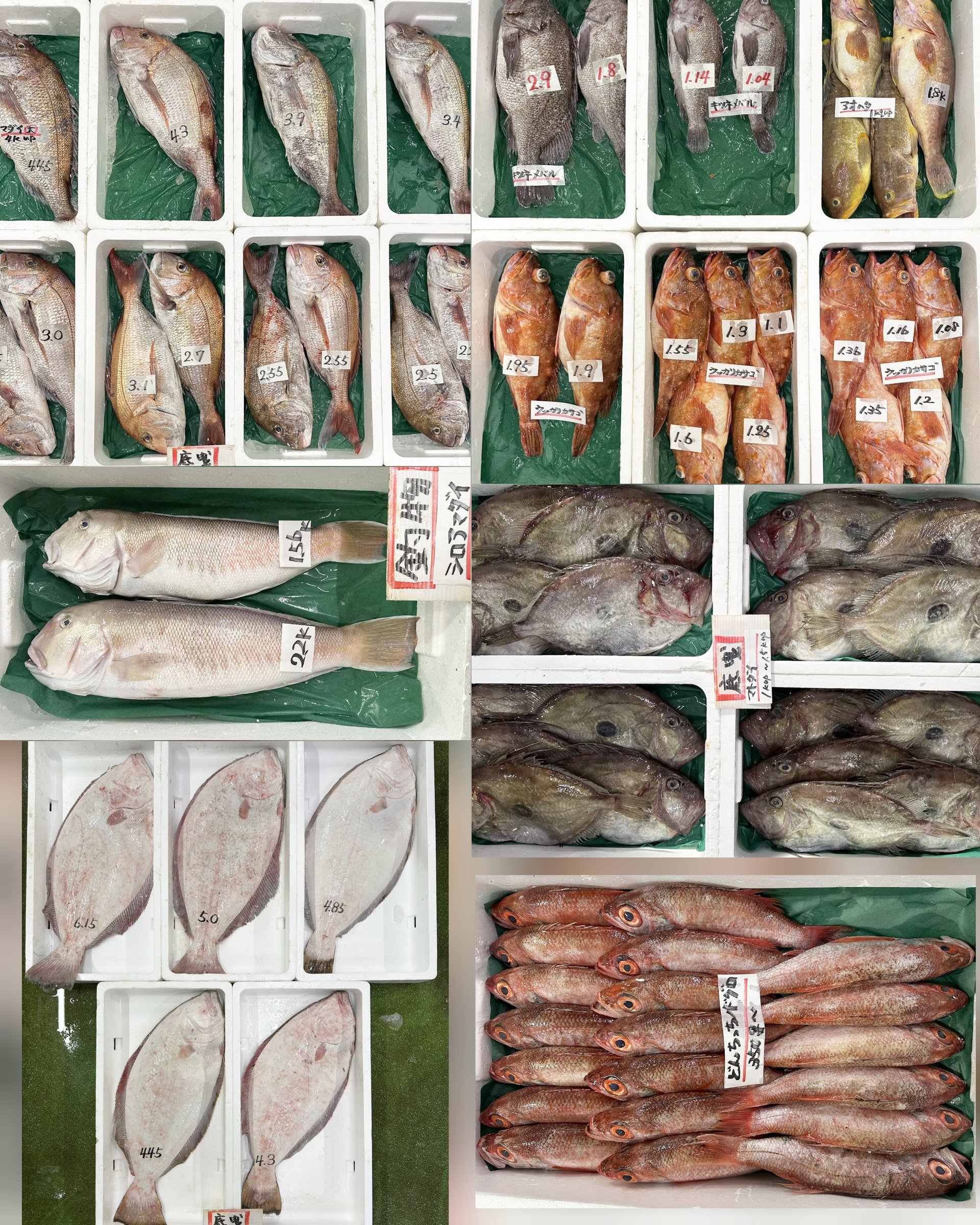 マダイ(大)、マダイ、ヒラメ、アオハタ、キツネメバル、ウッカリカサゴ、どんちっちノドグロ、マトダイ、アナゴ、ウスバハギ