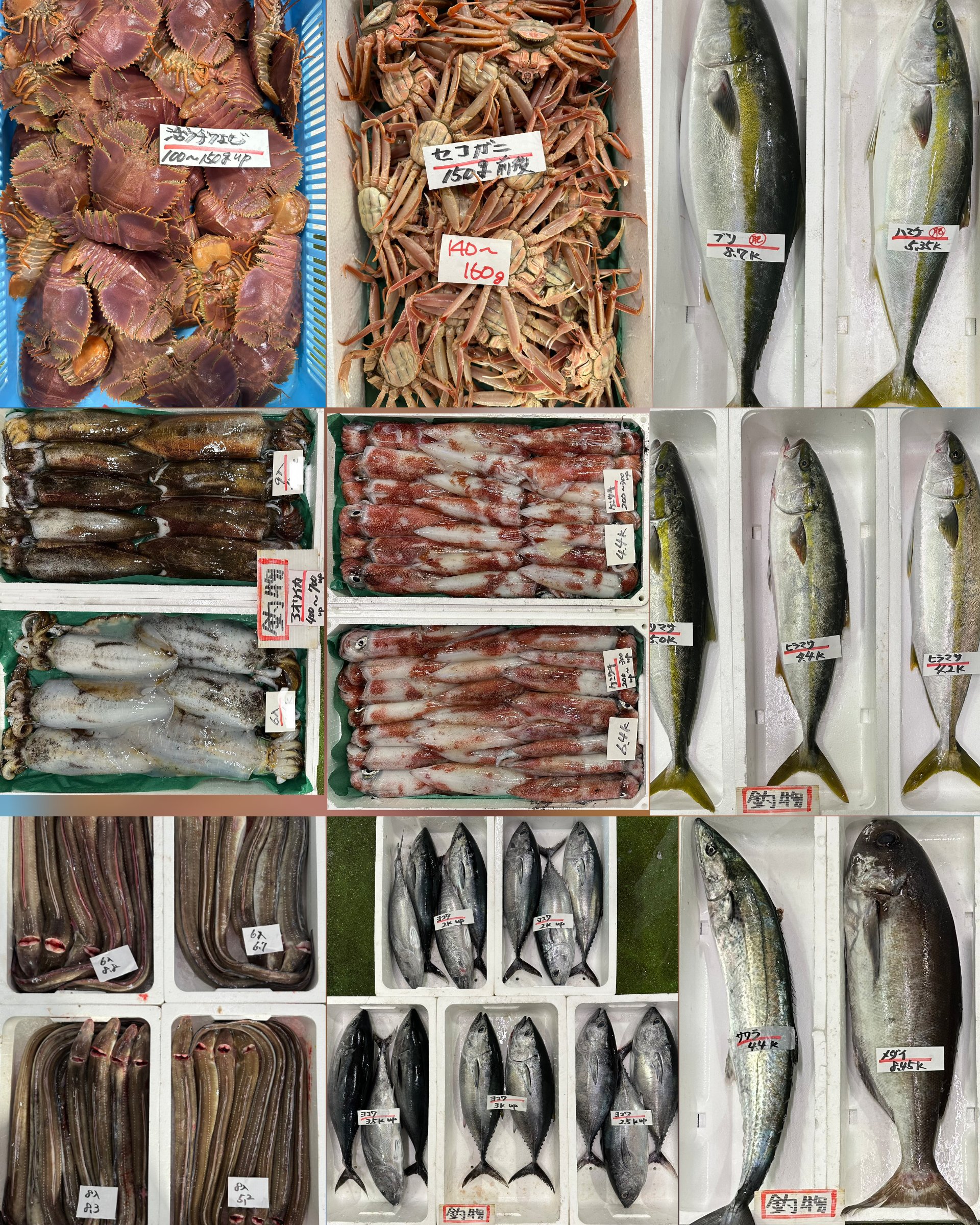ヨコワ、メダイ、サワラ、シロアマダイ、ヒラマサ、ブリマサ、ハマチ、ブリ、アオリイカ、ケンサキイカ