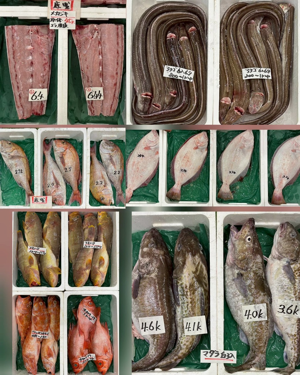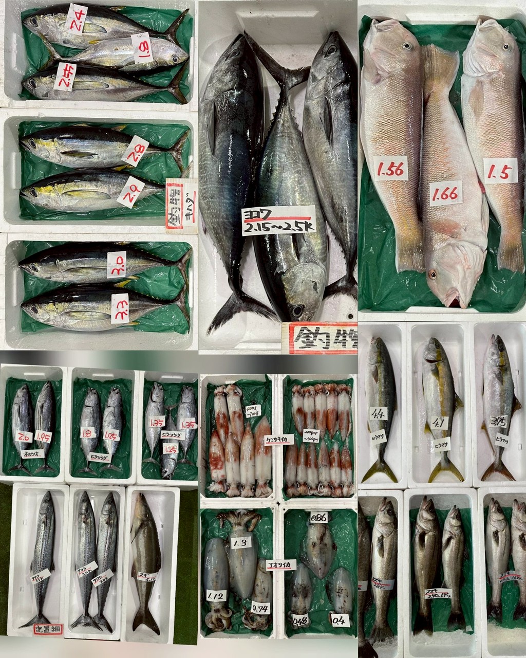■底曳マダイ、ヒラメ、アオハタ、チカメキントキ、ウッカリカサゴ、アナゴ、タラ白子入、メカジキ■釣物シロアマダイ、ヨコワ、キハダ、スズキ、ケンサキイカ、アオリイカ■定置網ヒラソウダ、ホウガツオ、スギ、サワラ