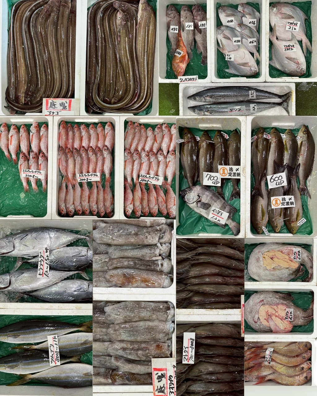 アンコウ、マトダイ、マダイ、マナガツオ、キツネメバル、ウッカリカサゴ、サワラ、アナゴ、どんちっちノドグロ、アオリイカ