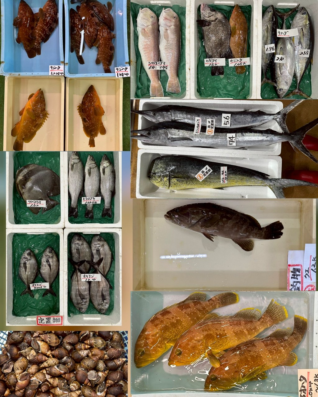ヒラソウダ、ツムブリ、イサキ、イシダイ、シイラ(片身OK)、バショウカジキ(片身OK)、ヒラスズキ、ツバメウオ、オキアジ、バイ貝