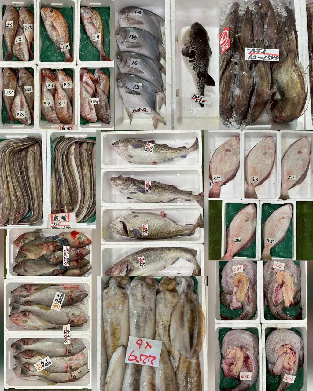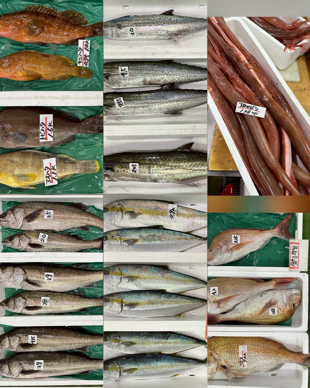 ■底曳タラ、ヒラメ、マトダイ、アナゴ、タラ白子入、マナガツオ、トラフグ、アカヤガラ、アンコウ■定置網ウマヅラハギ、ウスバハギ、アオリイカ■釣物キジハタ、トビハタ、アオハタ、マダイ、サワラ、スズキ、ヒラマサ
