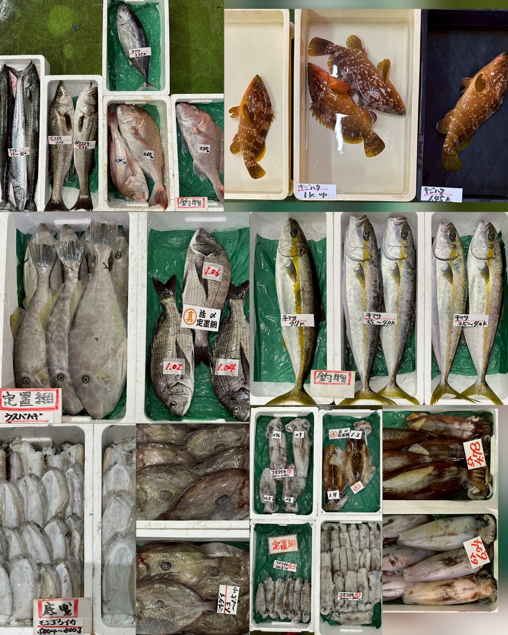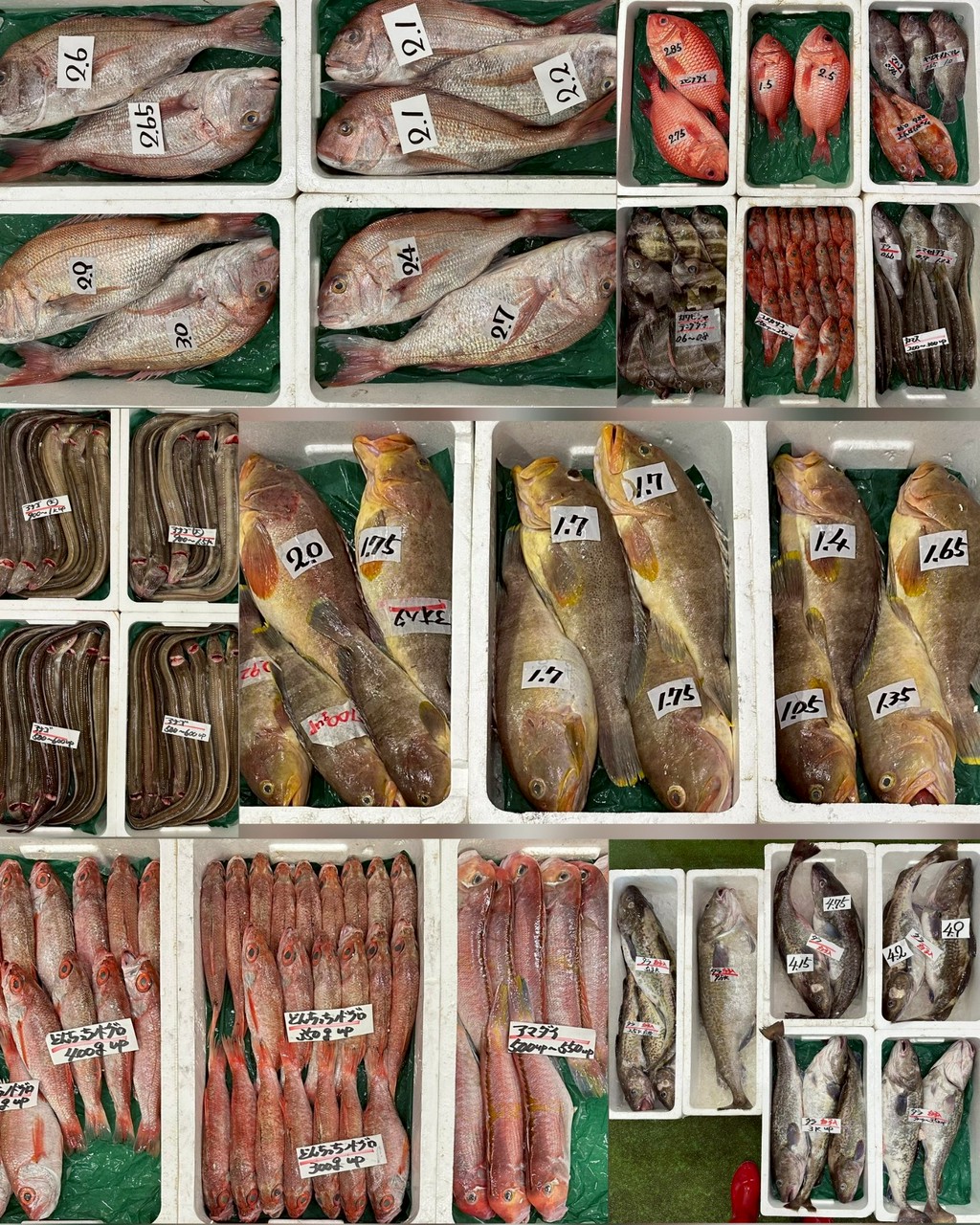 ■底曳タイ、マトダイ、アオハタ、アマダイ、どんちっちノドグロ、アナゴ、タラ白子入、キツネメバル、マハタ、ウッカリカサゴ、エビスダイ、シマセトダイ、アラ、カマス、ユメカサゴ、テングダイ、カワビシャモンゴウイカ