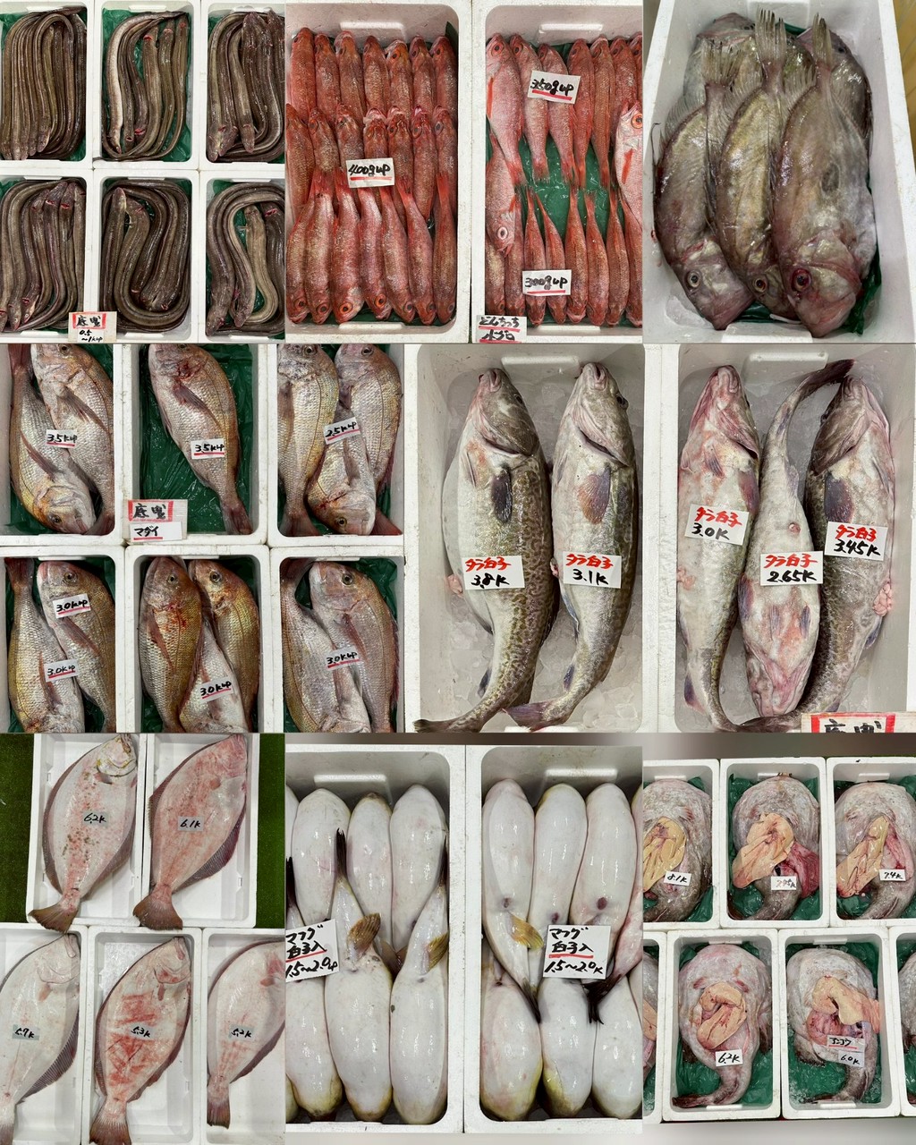 ■底曳マダイ、ヒラメ、アナゴ、マトダイ、エビスダイ、コショウダイ、キツネメバル、アオハタ、サメガレイ、アマダイ、アンコウ、マフグ白子入り、マフグ白子ナシ、タラ白子入り、どんちっちノドグロ、アオリイカ、活マツバ、シロミル、ヤマトシジミ