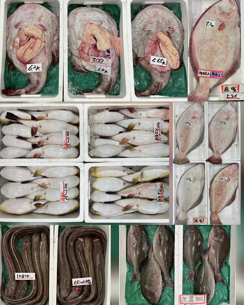 ■底曳マグロ白子入り、マグロ白子ナシ、アンコウ、アナゴ、ヒラメ(5.7〜6.1kg/7kg up)、ヒラメ(神経〆 7.3kg)