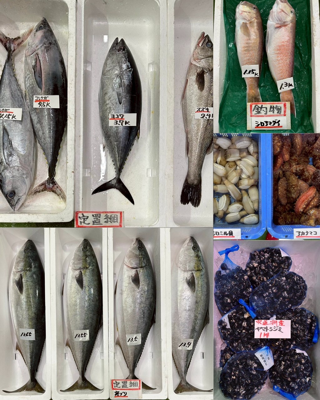 ■定置網寒ブリ(片身OK・13kg up)、スズキ、ヨコワ、コシナガ、オナガグレ(1kg up)