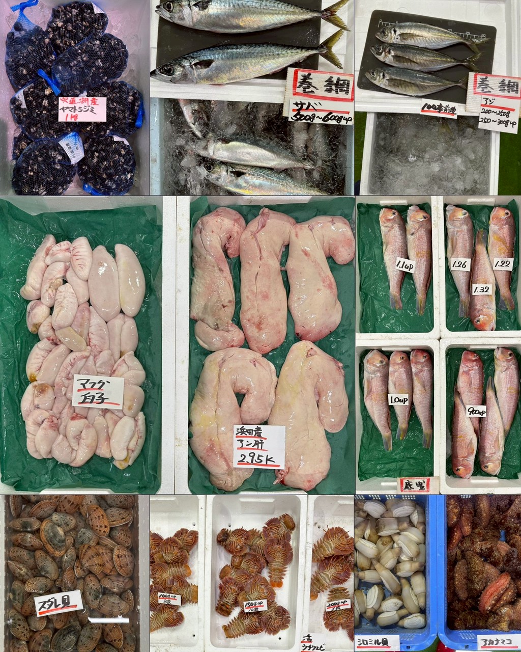 ■その他アカナマコ、シロミル、シジミ、スダレ貝、活ウチワエビ、アン肝、マフグ白子