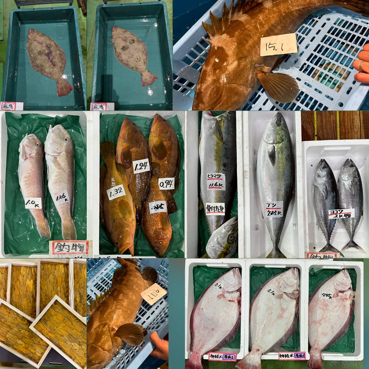 マダイ、ヒラメ(神経〆)、チカメキントキ、ヨロイイタチウオ、ウッカリカサゴ、アマダイ、エビスダイ、アンコウ(半分OK)、トラフグ、マフグ、マフグ白子入り、ミズダコ、アナゴ、モンゴウイカ、アオリイカ