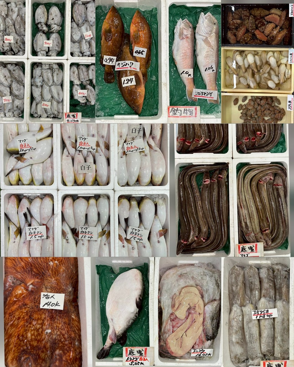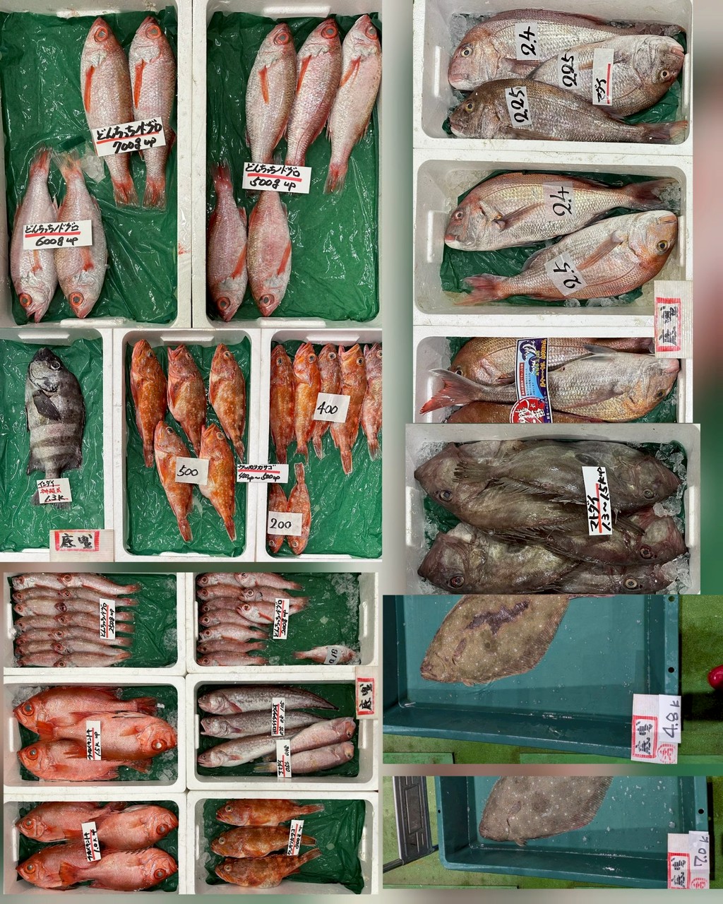 ■底曳マダイ、マトダイ、アンコウ、トラフグ白子あり、マフグ白子あり、マフグ無し、アナゴ、どんちっちノドグロ、チカメキントキ、ヨロイイタチウオ、アマダイ、ウッカリカサゴ、活メイチダイ、どんちっちノドグロ(大)、活ヒラメ、ミズダコ、アオリイカ、モンゴウイカ■釣物シロアマダイ、キジハタ