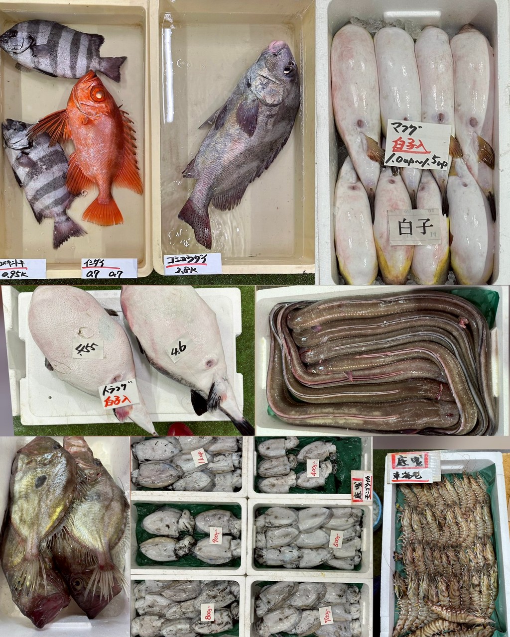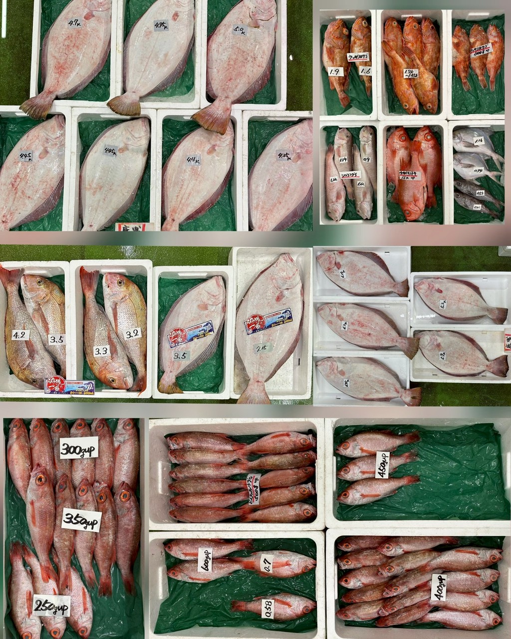 ■底曳マダイ(沖獲れ)、ヒラメ(沖獲れ)、ヒラメ、ウッカリカサゴ、マナガツオ、クロムツ、チカメキントキ、シロアマダイ、どんちっちノドグロ、クルマエビ、アナゴ、モンゴウイカ、マトダイ、活イシダイ、コショウダイ