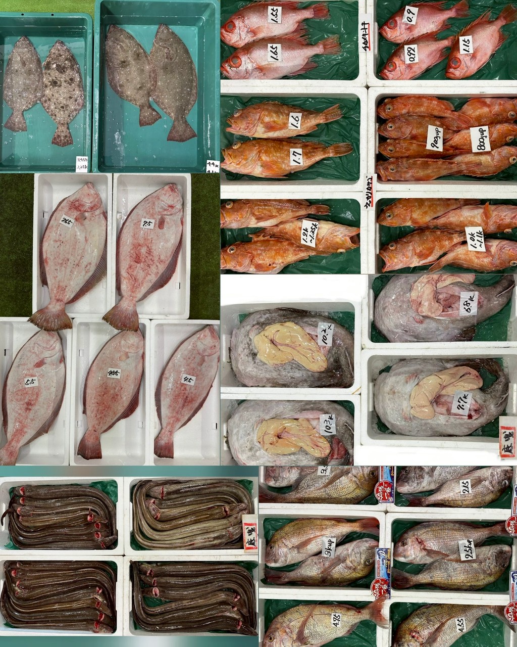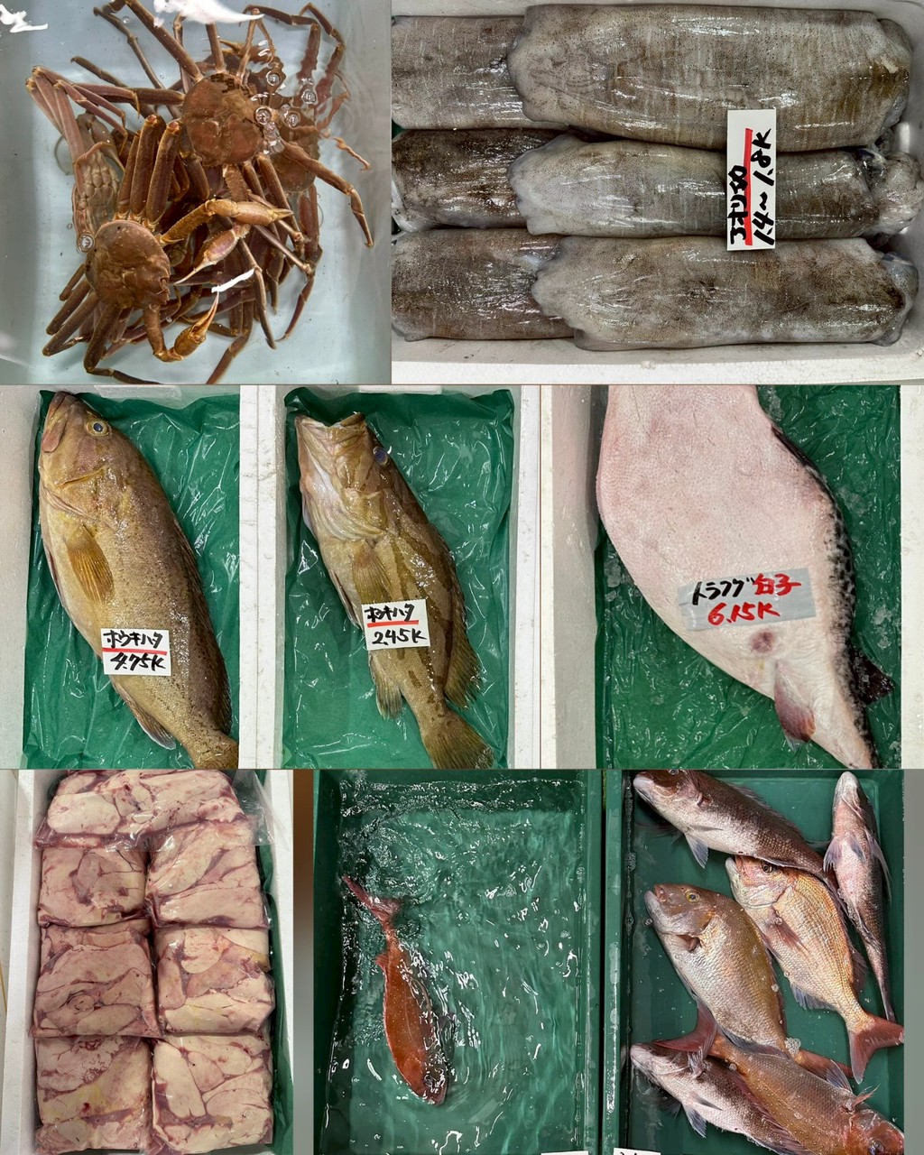 ■底曳活ヒラメ、活マダイ、マダイ(沖獲れ)、アナゴ、アンコウ、ヒラメ、チカメキントキ、ウッカリカサゴ、ホウキハタ(神経〆・腹抜)トラフグ(白子入り)