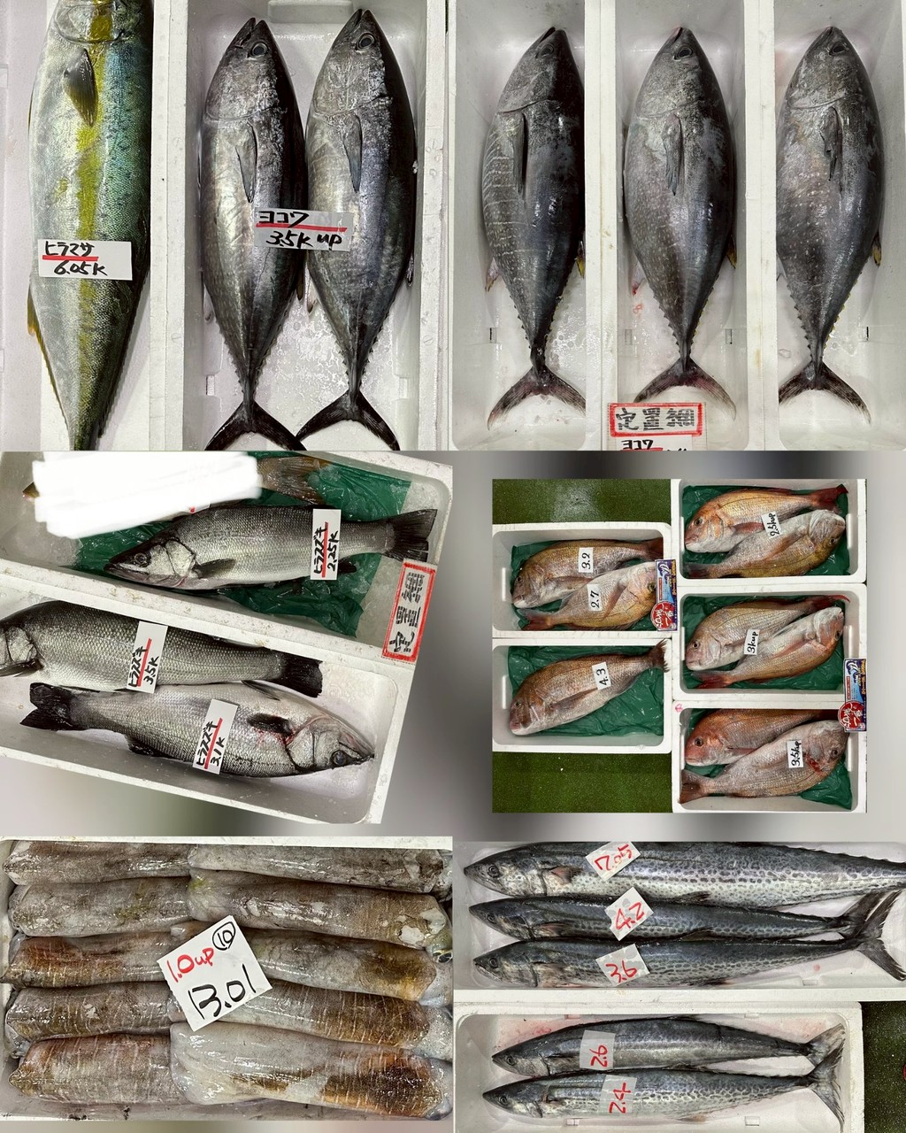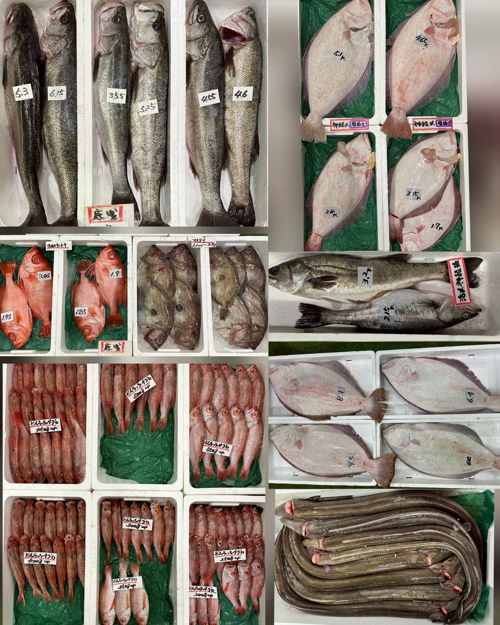■底曳マトダイ、チカメキントキ、ヒラメ、マダイ、サワラ、アナゴ、スズキ、スズキ(神経〆)、ヒラメ(神経〆)、どんちっちノドグロ、アオリイカ
