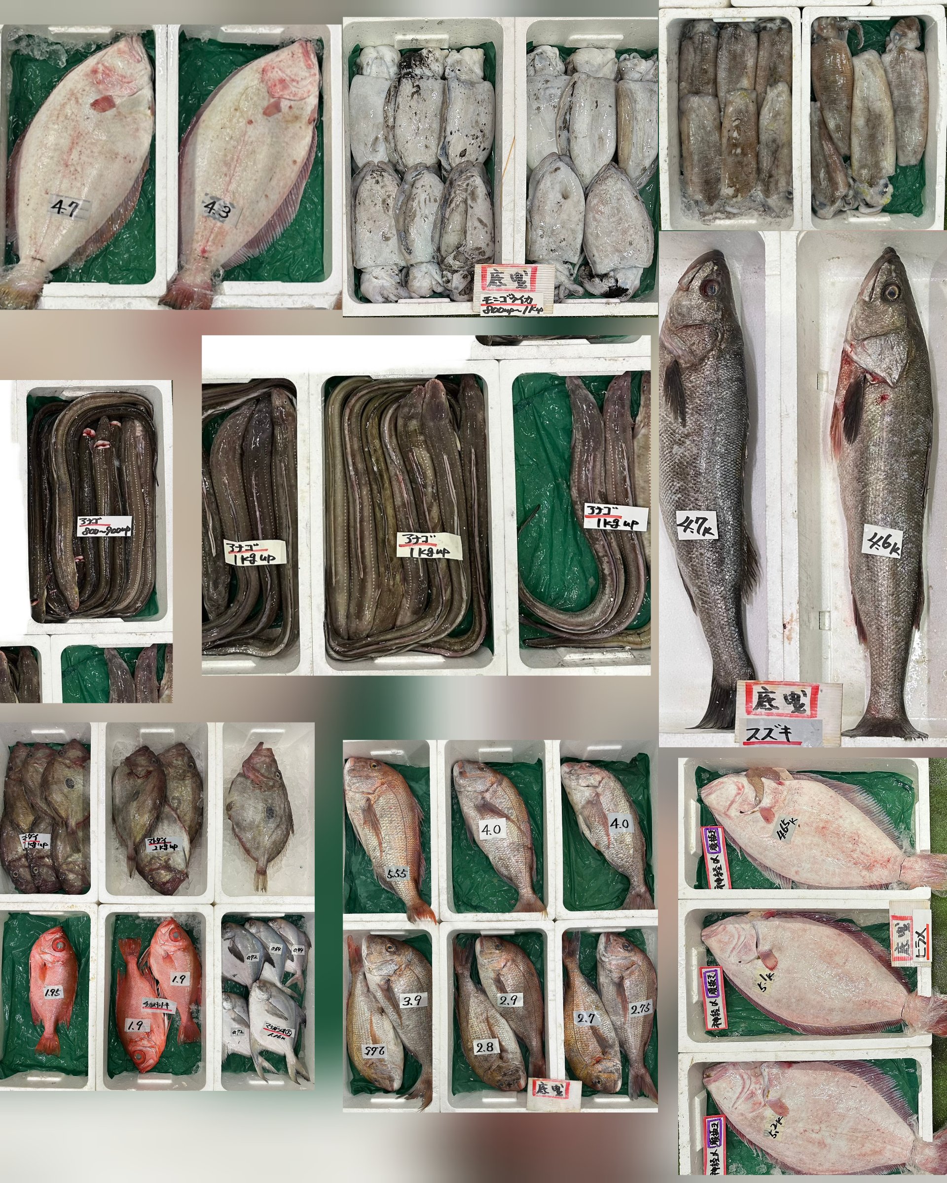 ヒラメ(4k up/6k up/神経抜)、マダイ、マトダイ、マナガツオ(各サイズ)、チカメキントキ、スズキ、アナゴ、アオリイカ、モンゴウイカ、活トラフグ(白子/白子なし)、あん肝1㎏入り