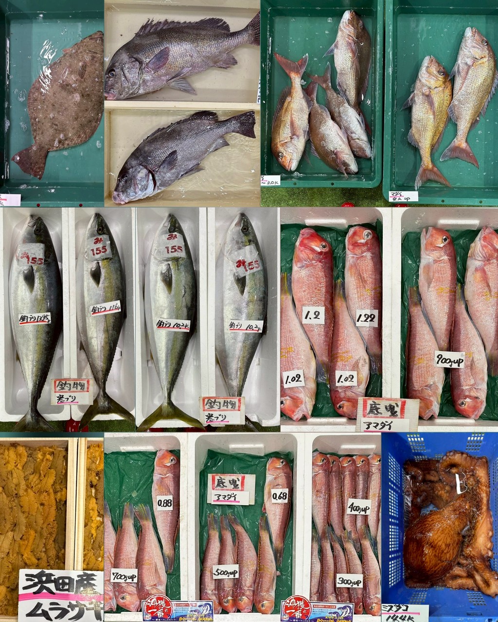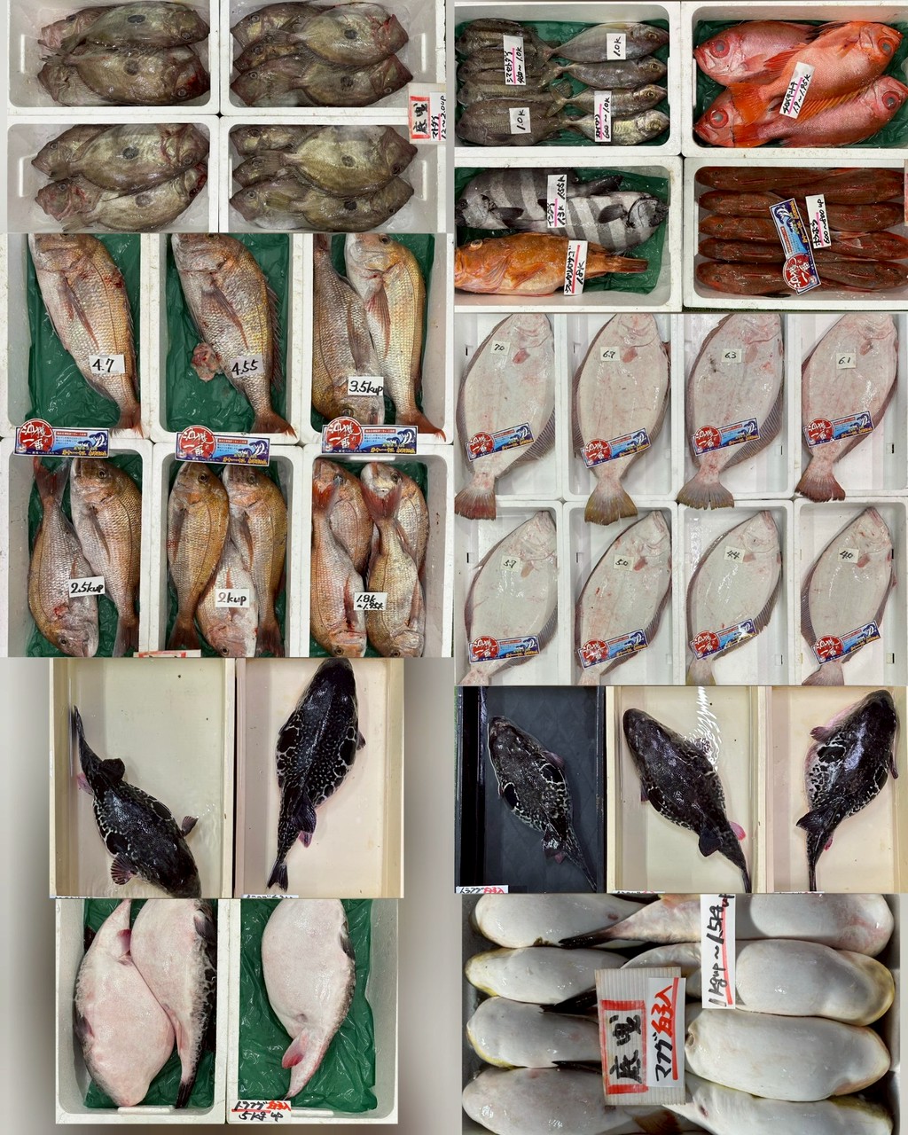 ■底曳ヒラメ(沖獲れ)、タイ(沖獲れ)、ホウボウ、シマセトダイ、カイワリ、チカメキントキ、イシダイ、ウッカリカサゴ、マトダイ、アマダイ、マダイマフグ白子、トラフグ白子、活トラフグ白子、活トラフグ白子無し活マダイ、活コショウダイ、活ヒラメ(肥えてます)、活ミズダコ