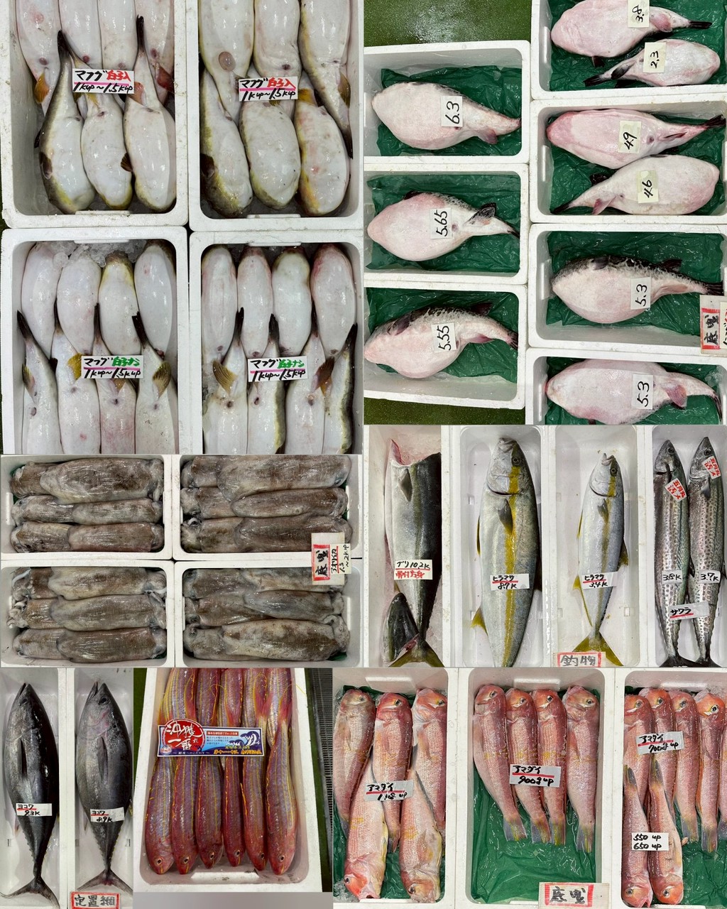 おはようございます。 本日の情報をお知らせいたします。 ■底曳 タイ、ヒラメ、ヒラメ(沖獲れ)、スズキ、マトダイ、イトヨリ、キツネメバル、アオハタ、アナゴ マグロ白子無し、マグロ白子入り トラフグ白子入り アオリイカ ■釣物 サワラ、ヒラマサ、ヒラマサ(片身OK)、寒ブリ ■定置 ヨコワ(片身OK)
