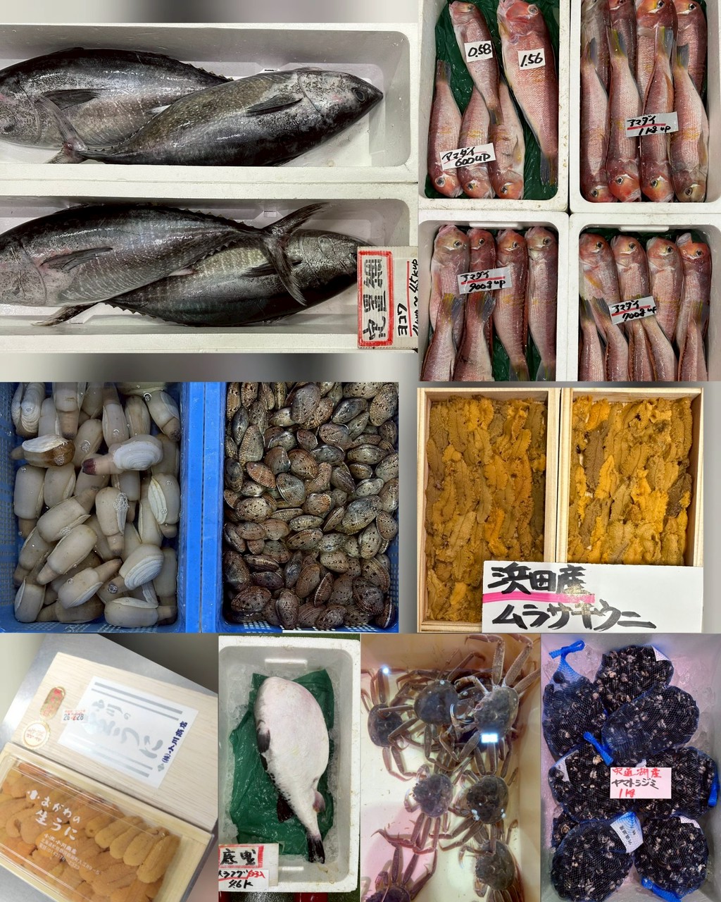 ■底曳タイ、ヒラメ、マフグ(白子無し)、トラフグ(白子入)、ホウボウ、アオハタ、マトダイ、キツネメバル、イシダイ、アマダイ、どんちっちノドグロ、活トラフグ(白子無し)