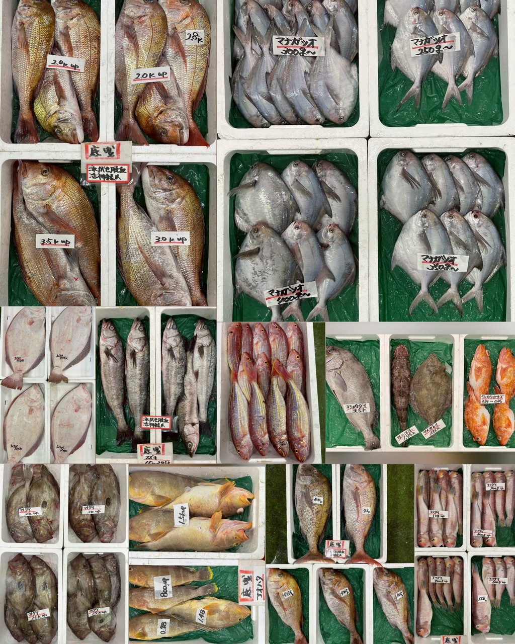 ■底曳マダイ(活〆)、ヒラメ、マトダイ、ウッカリカサゴ、サメガレイ、ワニゴチ、コショウダイ、イトヨリ、スズキ(活〆)、アオハタ、マナガツオ、アマダイ、活ヒラメ(肥)、マハタ、アオリイカ、モンゴウイカ