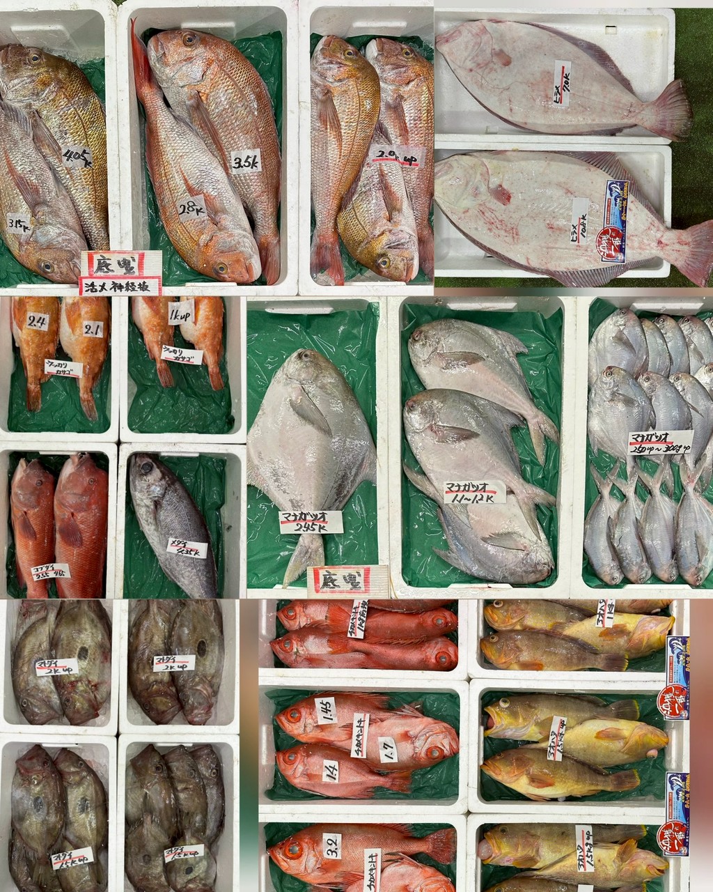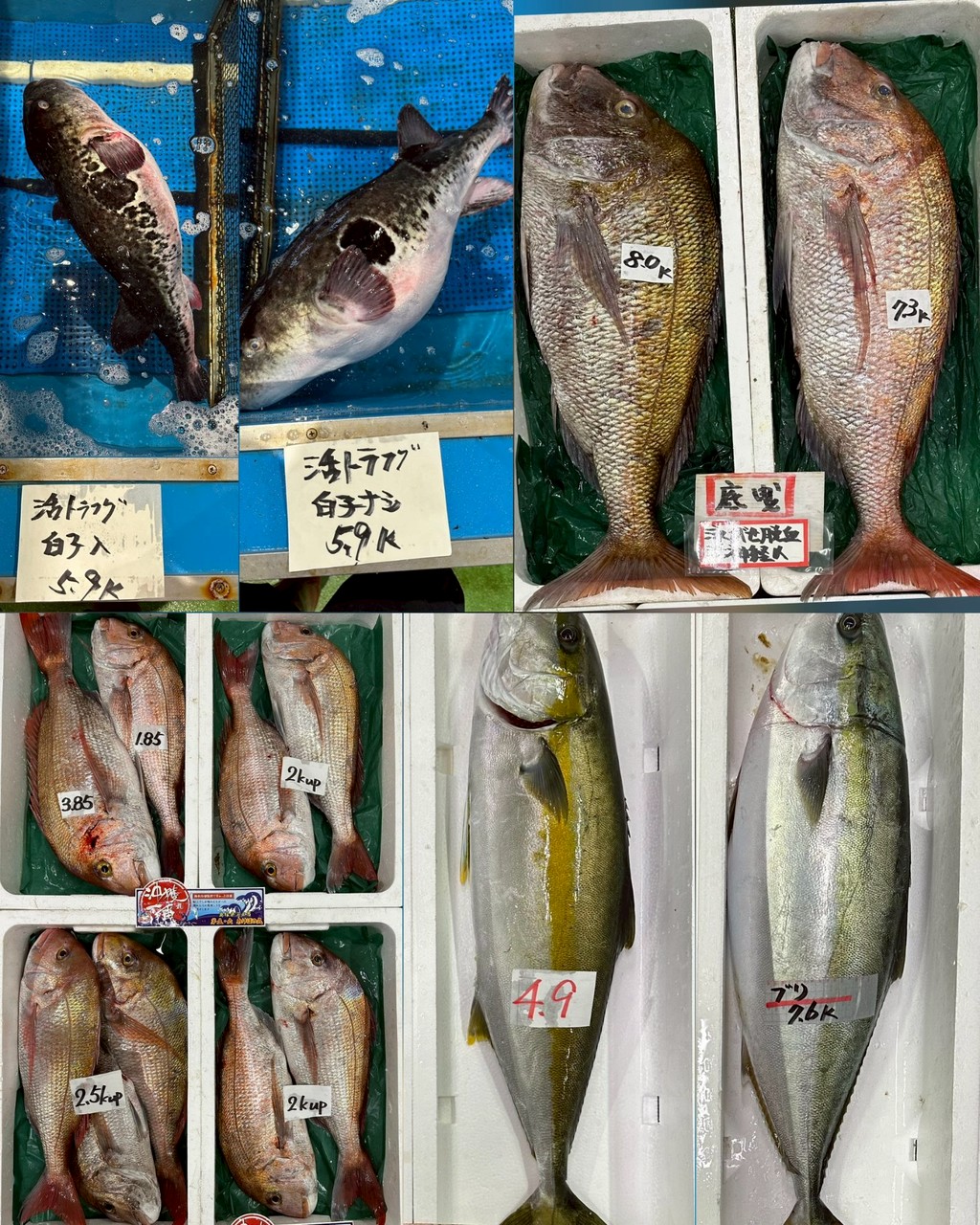 ■底曳活トラフグ(白子入り・無し)、チカメキントキ、アオハタ、ウッカリカサゴ、マナガツオ、マトダイ、ヒラメ、ヒラメ(沖獲れ)、タイ(活〆)、タイ(活〆・肥)、タイ、スズキ、アナゴ、メダイ、コブダイ、どんちっちノドグロ