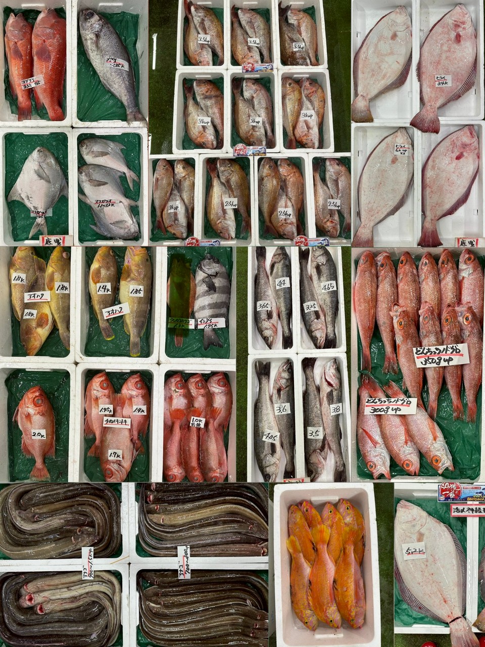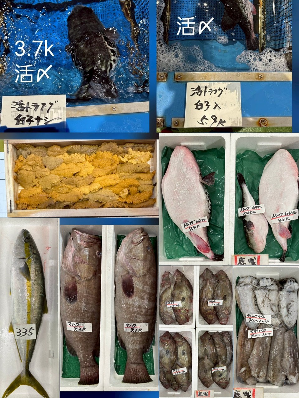 ■底曳タイ(沖獲れ)、メダイ、コブダイ、マナガツオ、イシダイ、アオハタ、チカメキントキ、アカイサキ、スズキ、アナゴ、ヒラメ、ヒラメ(沖獲れ)、マトダイ、どんちっちノドグロモンゴウイカ、アオリイカトラフグ(白子ナシ)、トラフグ(白子ナシ・活〆)、トラフグ(白子アリ・活〆)