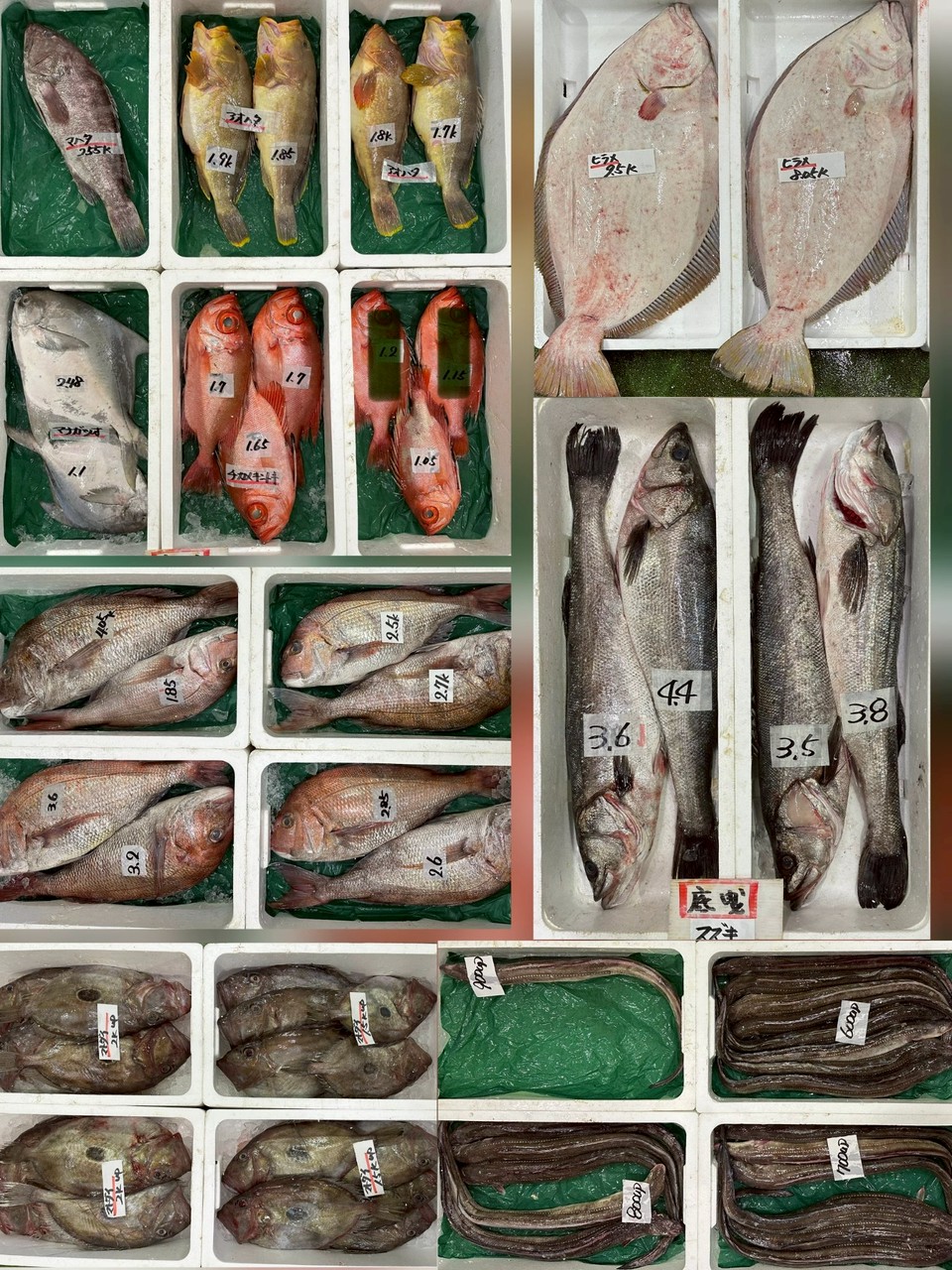 ■底曳ヒラメ、タイ、アオハタ、マハタ、チカメキントキ、マナガツオ、スズキ、マトダイ、アナゴ、アンコウトラフグ(白子ナシ)、マフグ(白子入)