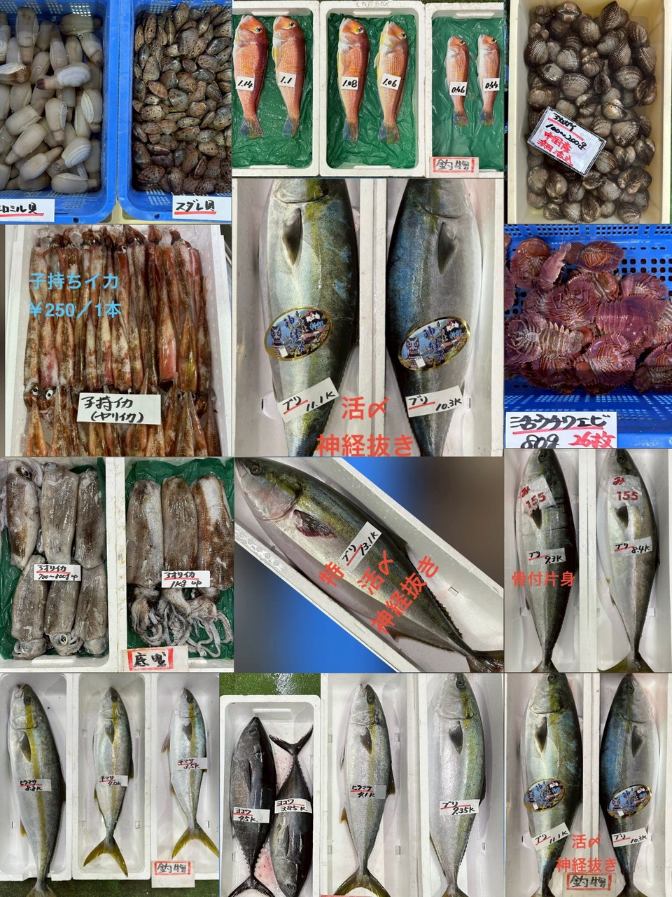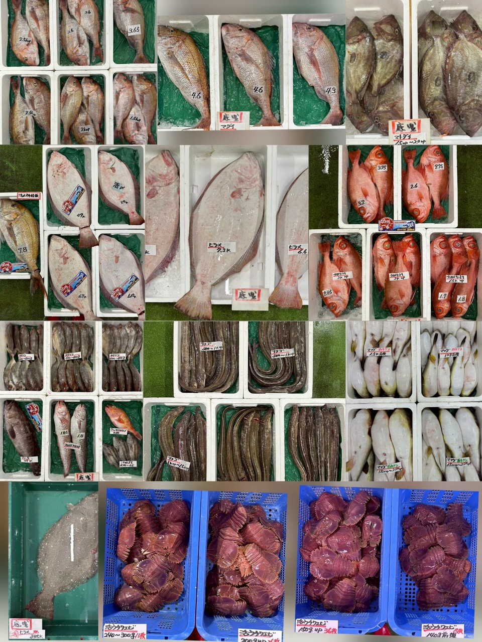 ■底曳タイ、ヒラメ、活〆ヒラメ(沖獲れ)、タイ(神経〆)、マトダイ、チカメキントキ(沖獲れ)、カイワリ、ウッカリカサゴ、シマセトダイ、ヨロイイタチウオ、マハタ(沖獲れ)、アナゴ、マフグ(白子有)、マフグ(白子ナシ)