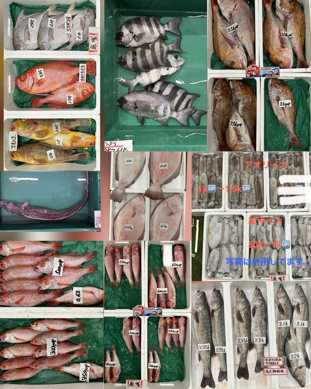 ■底曳活イシダイ、活クロアナゴ、タイ(沖獲れ)、ヒラメ、マナガツオ(1K up)、チカメキントキ、アオハタ、スズキ(神経〆)、アマダイ(沖獲れ)、どんちっちノドグロ、モンゴウイカ、アオリイカ