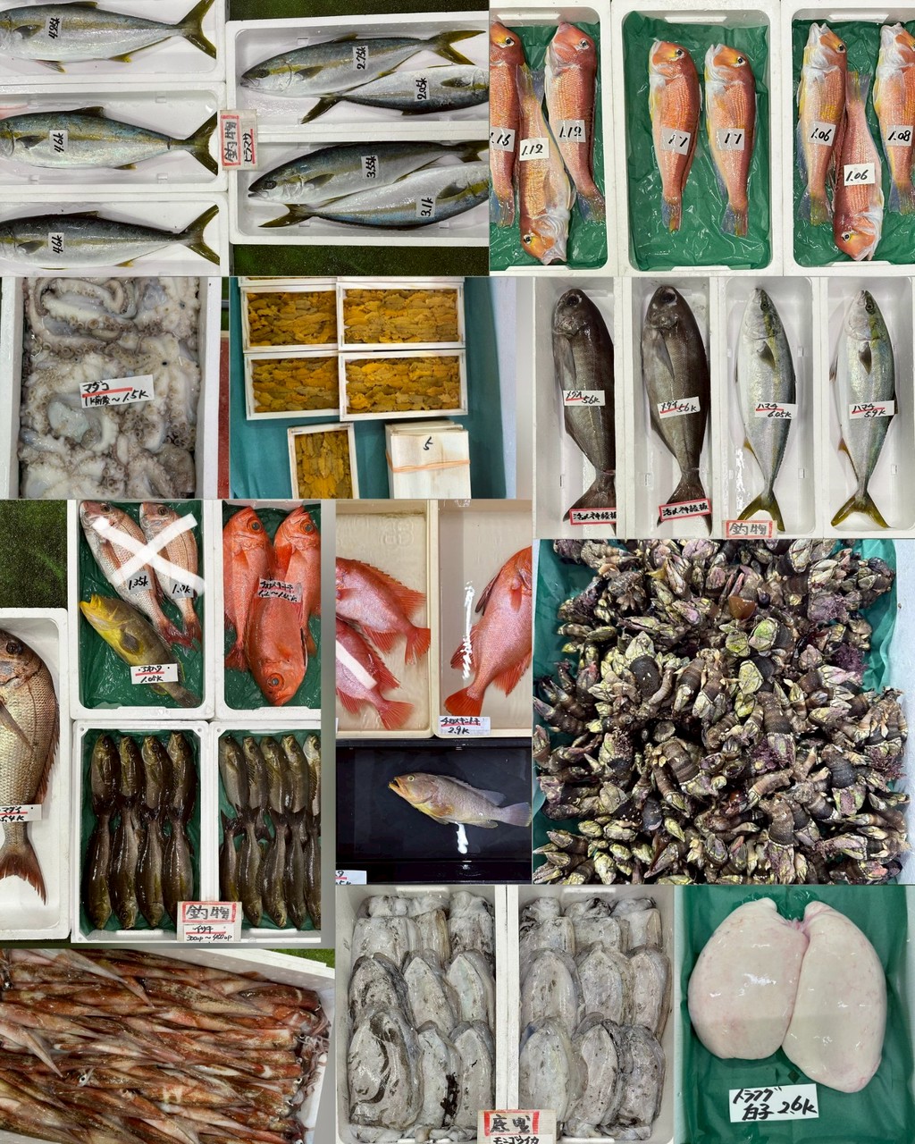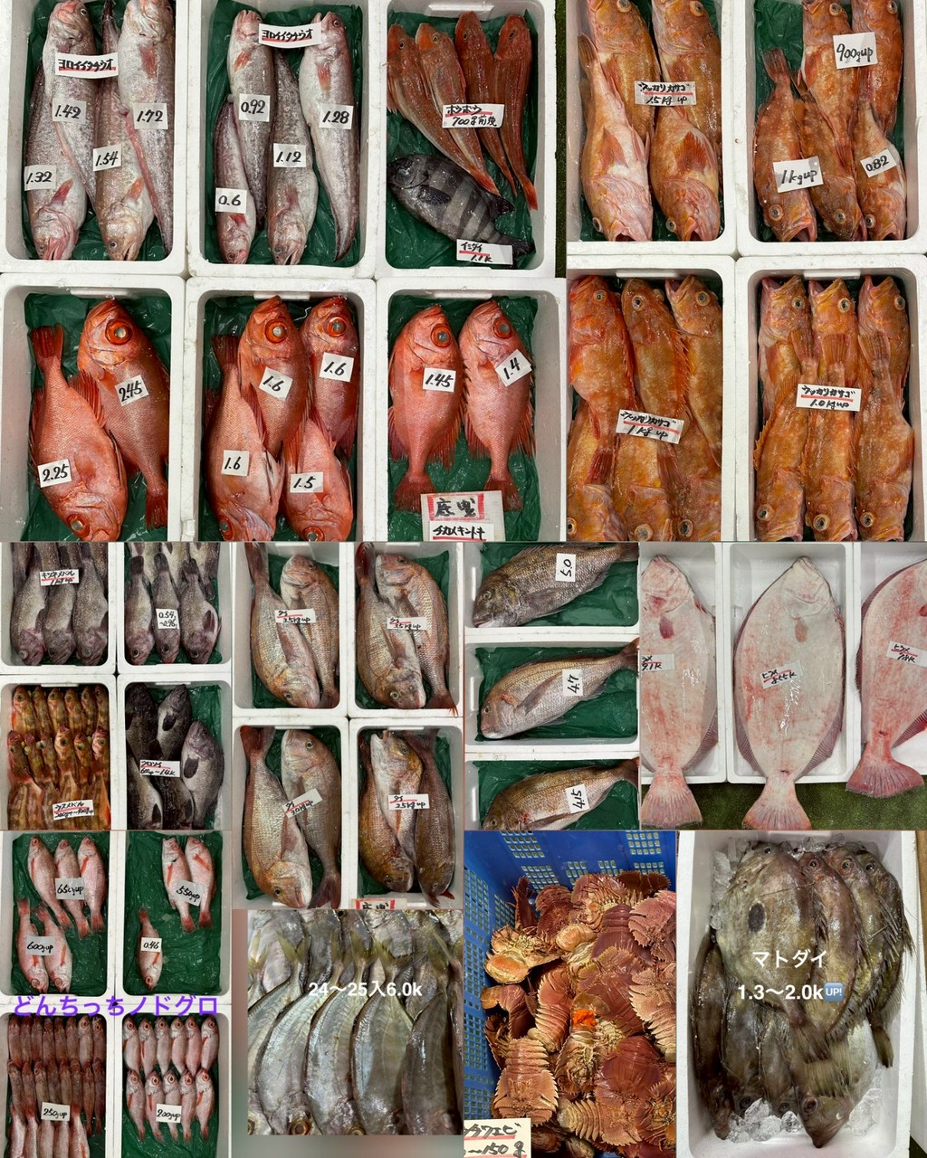 ■底曳タイ(大)、タイ、ヒラメ、ウッカリカサゴ、チカメキントキ、キツネメバル、クロソイ、ウスメバル、ヨロイイタチウオ、ホウボウ、イシダイ、どんちっちノドグロ、マトダイ、マダコ