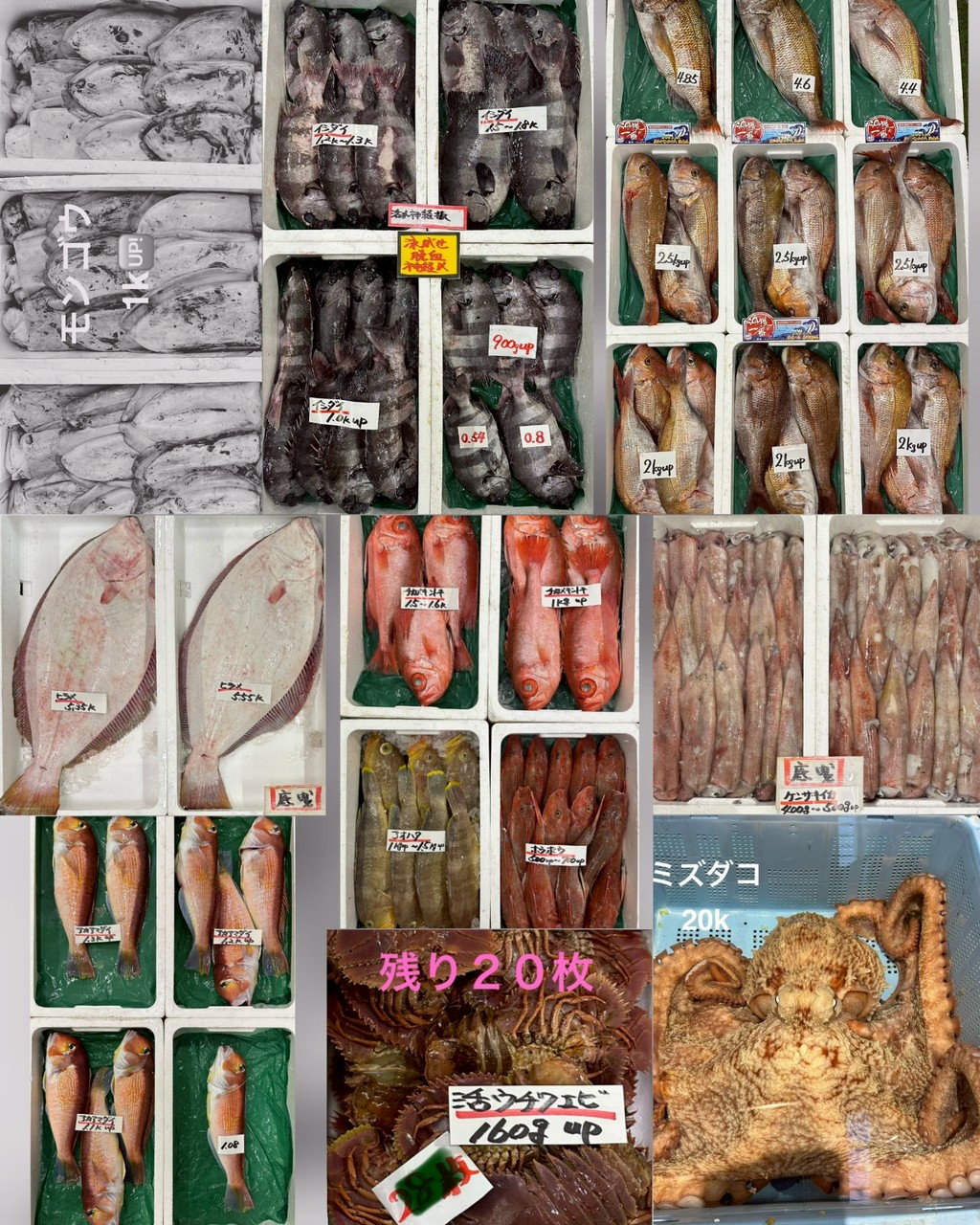 マダイ(沖獲れ・4k up/2.3~2.5k up)、ヒラメ、チカメキントキ、ホウボウ、アオハタ、イシダイ(泳がせ脱血)、モンゴウイカ、ケンサキイカ、アオリイカ、活ミズダコ、活ウチワエビ