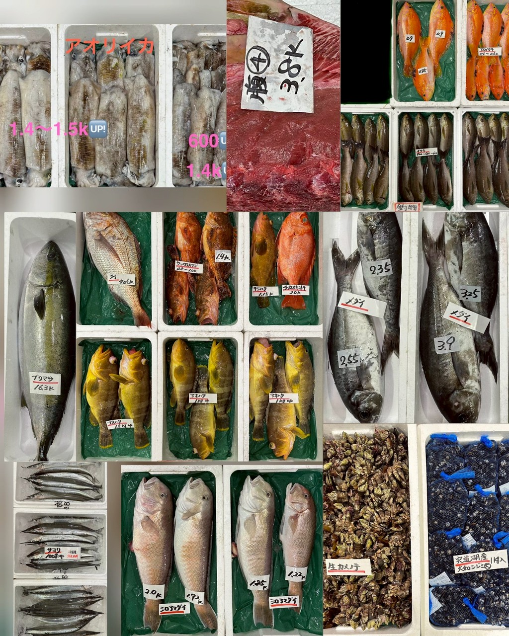 アマダイ(1k up)、シロアマダイ(1.2/1.8k up)、チカメキントキ(2.0)、キジハタ(1.5)、マダイ、アオハタ、ウッカリカサゴ、アカイサキ、イサキ、メダイ、ブリ(片身OK・6.8)
