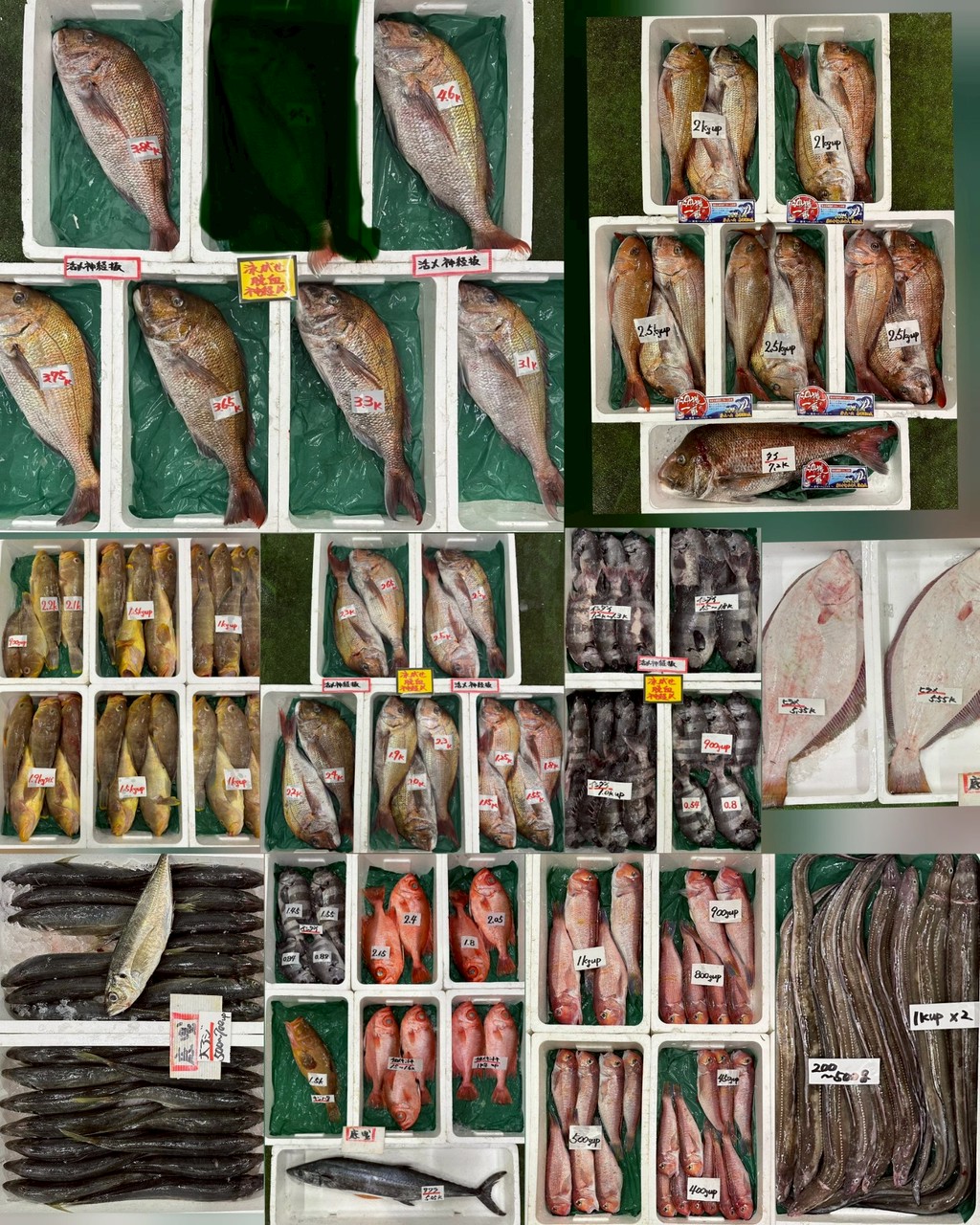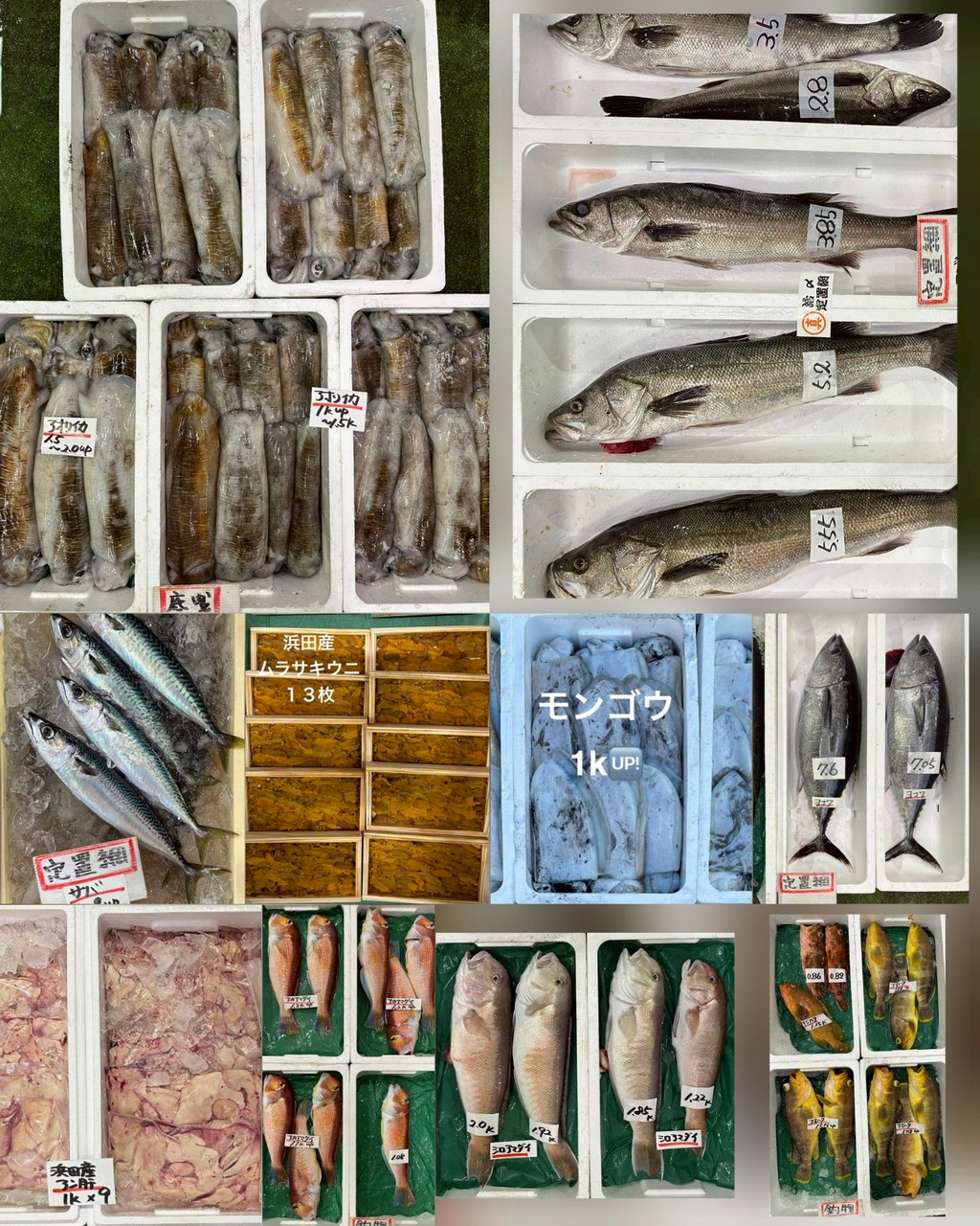 ■底曳タイ(泳がせ脱血)、タイ、ヒラメ、アオハタ、イシダイ(泳がせ脱血)、チカメキントキ、イシダイ、キジハタ、サワラ、アジ、アナゴ、アマダイ(300~1k up)、モンゴウイカ、アオリイカ、あん肝(1k入)、イシダイ白子