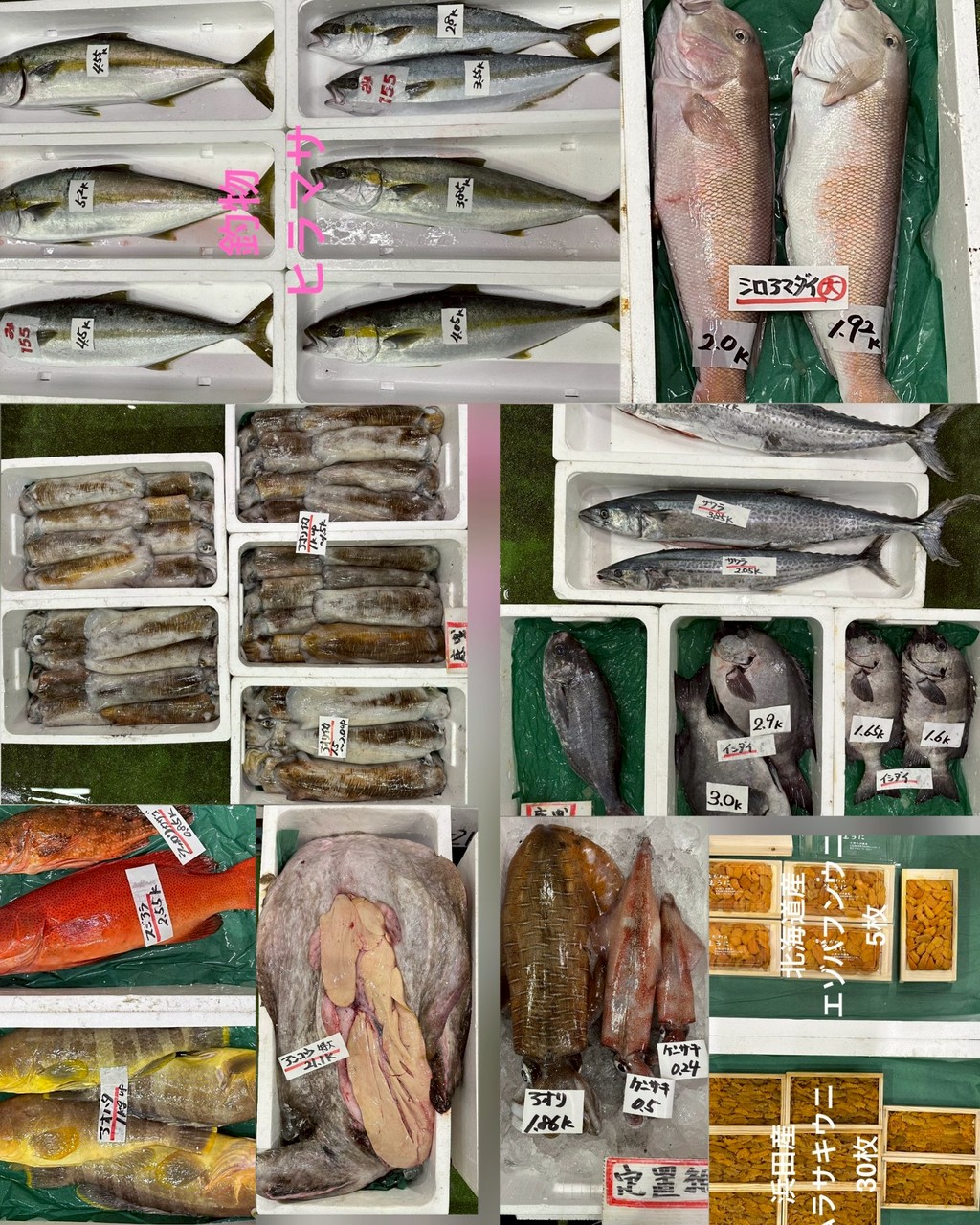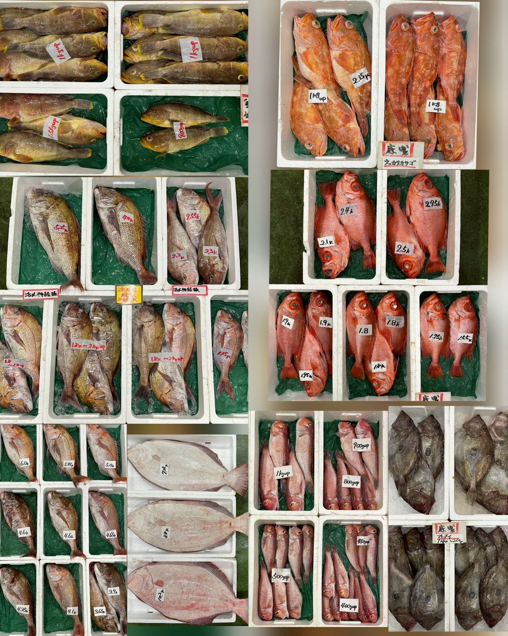 ■底曳タイ(泳がせ)、タイ、ヒラメ、チカメキントキ、ウッカリカサゴ、アオハタ、アンコウ、サワラ、イシダイ、マトダイ、アマダイ、アオリイカ