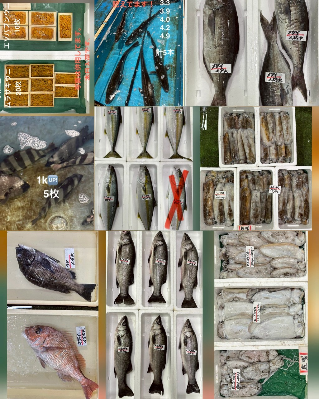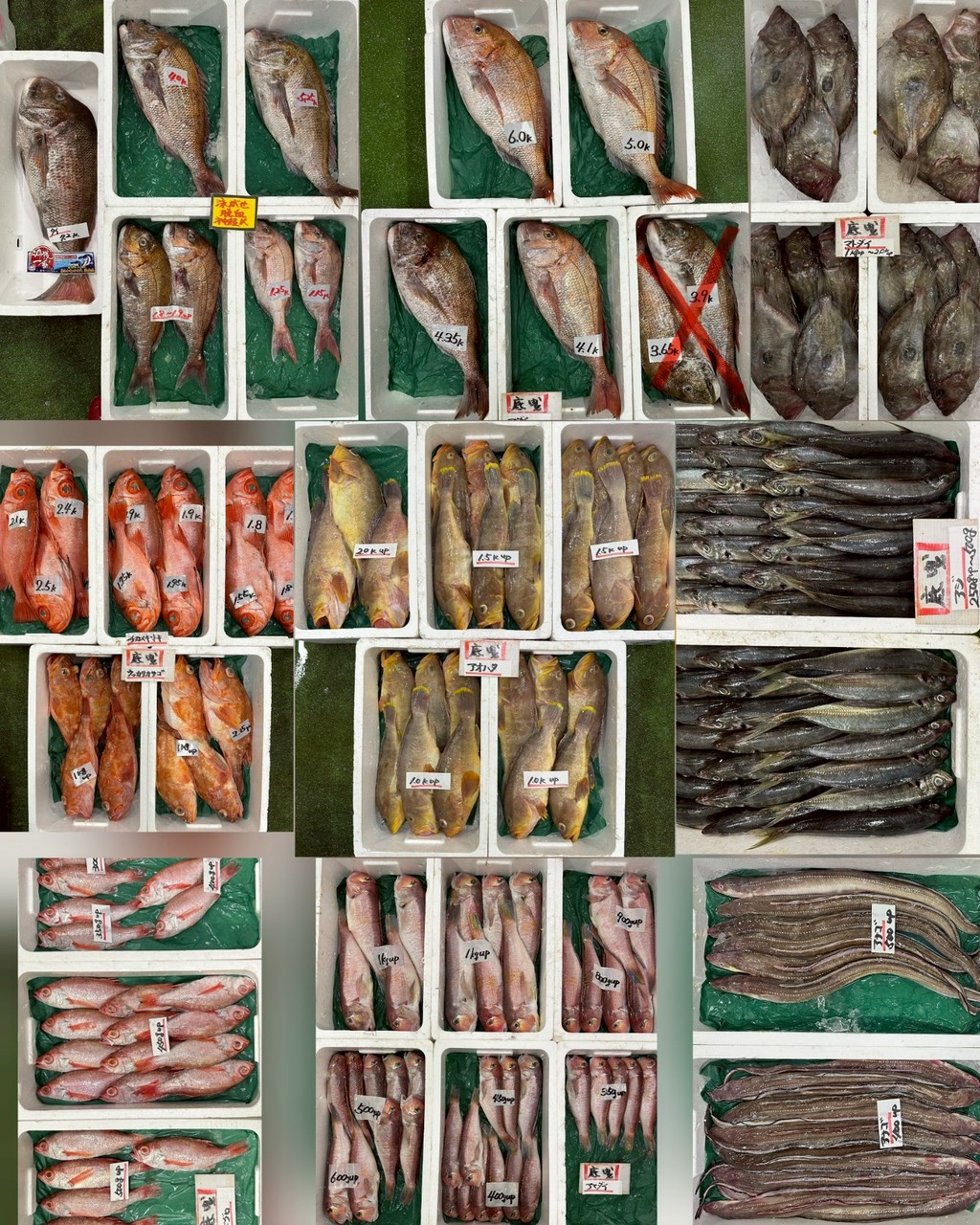 タイ(4.1~6.0)、タイ(沖獲れ・7.2)、タイ(泳がせ)、アジ、アオハタ、チカメキントキ、ウッカリカサゴ、マトダイ、アナゴ(400~、500~)、アマダイ(350~/400~450/500~/600~/700~/800~/900~1k up)、ノドグロ(300~、350~、400~、450~、500~)、アオリイカ、ヒメコウイカ、モンゴウイカ