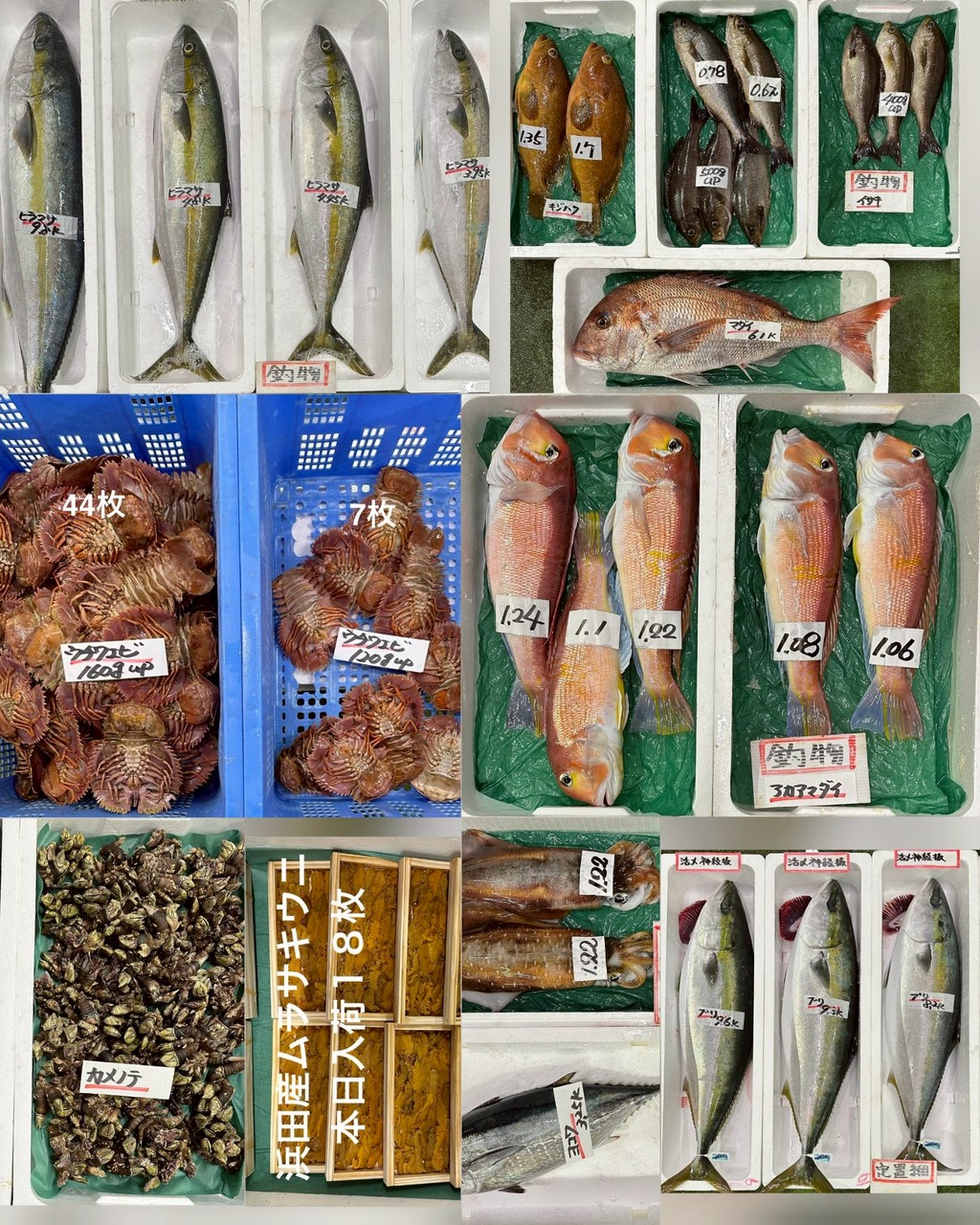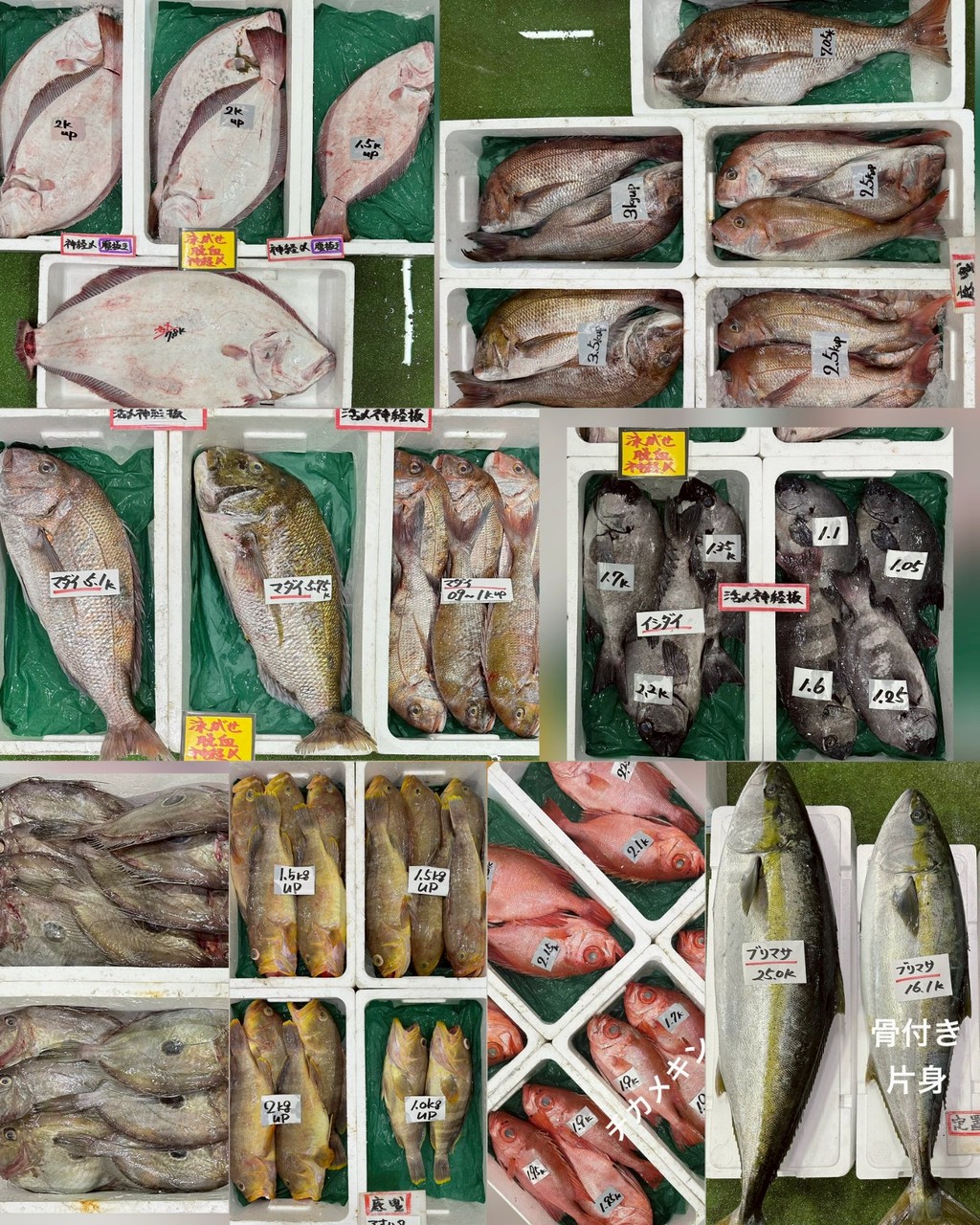 ■定置網ブリ(片身OK・脂あり・神経抜)、ブリマサ(片身OK)、ヒラスズキ、ヨコワ、アオリイカ