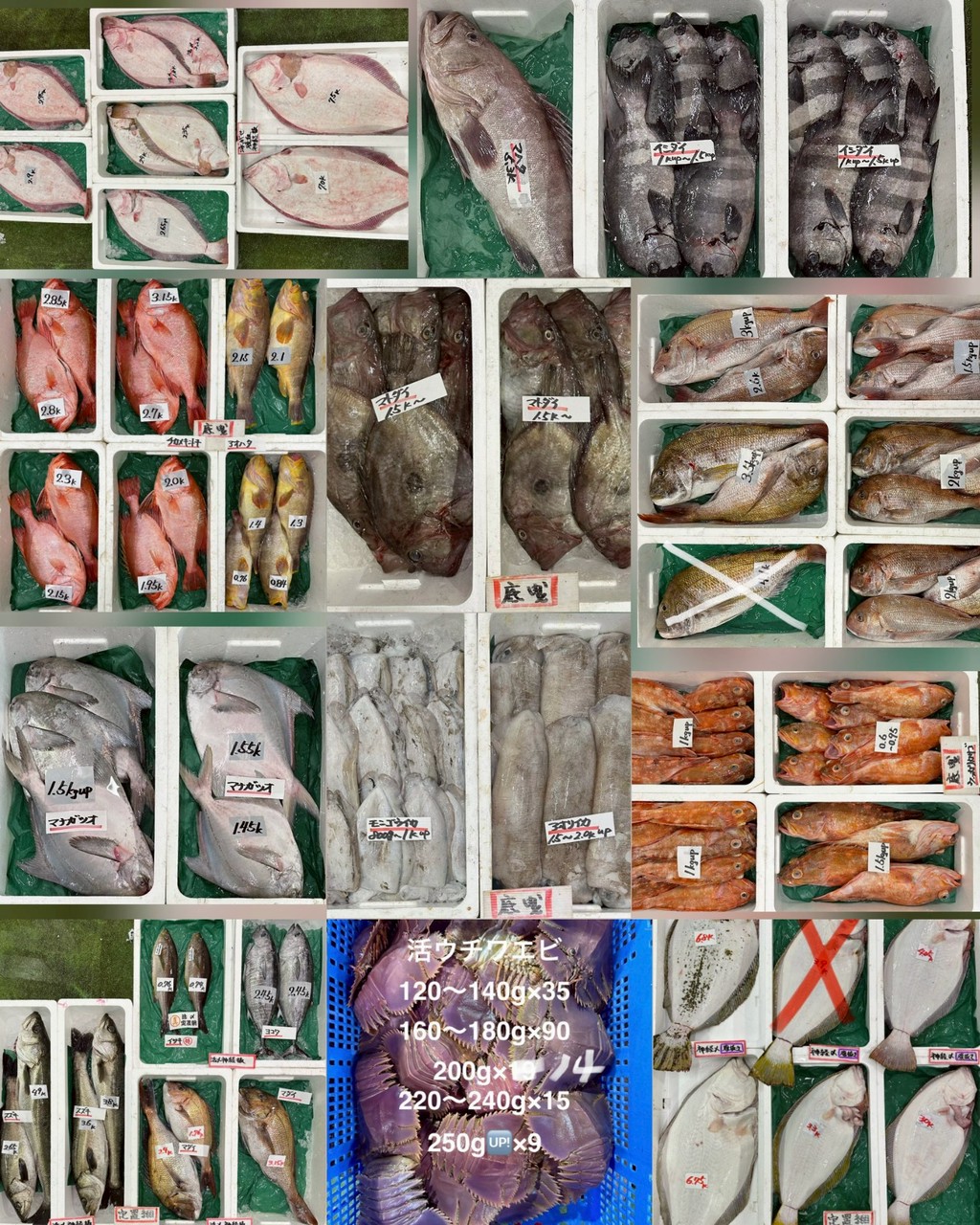 マダイ、ヒラメ、マトダイ、アオハタ、チカメキントキ、マナガツオ(1.45~1.5k up)、イシダイ、マハタ、ウッカリカサゴ、アオリイカ、モンゴウイカ、活ウチワエビ
