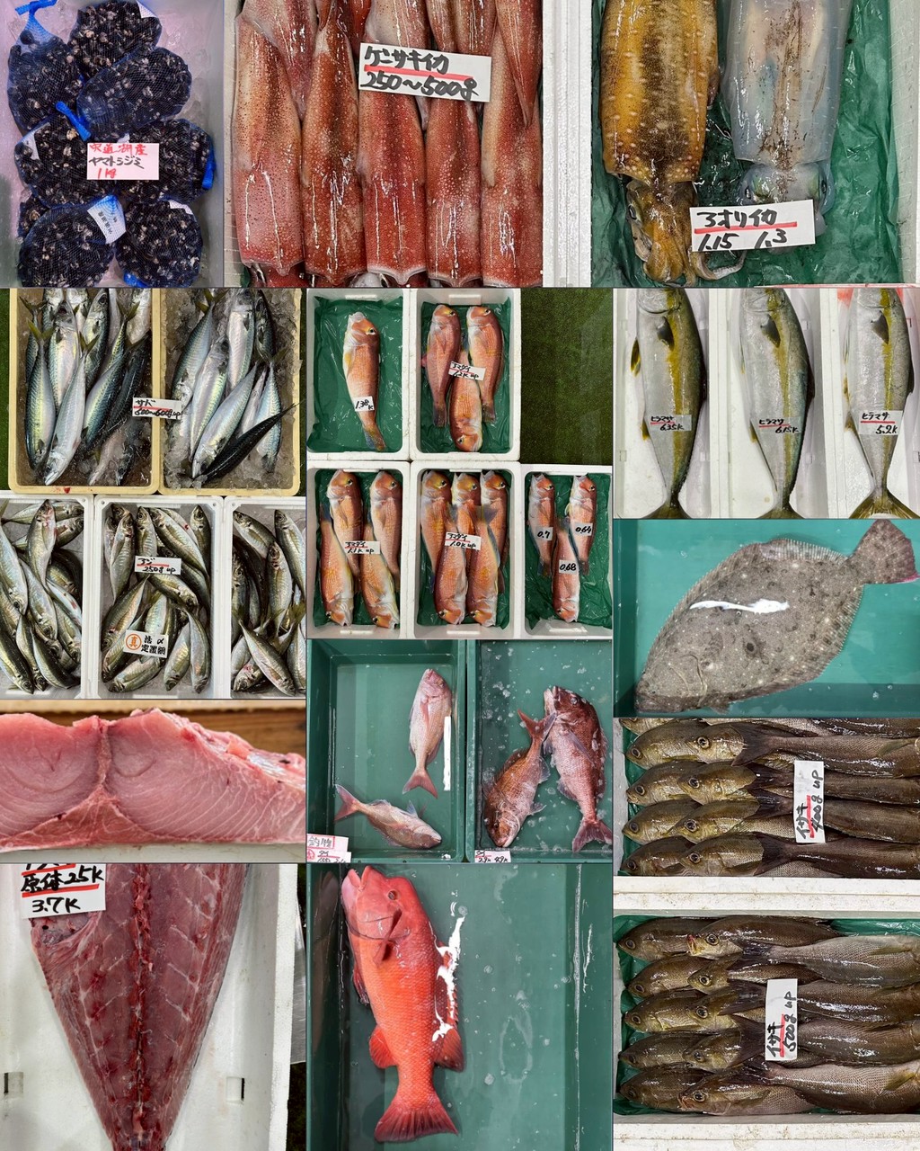 ヨコワ、イサキ、タイ、スズキ(神経〆)、ヒラメ(神経〆)、サバ(500~700g up)、アジ(250g~)、ブリマサ(25k・片身OK・脂有)