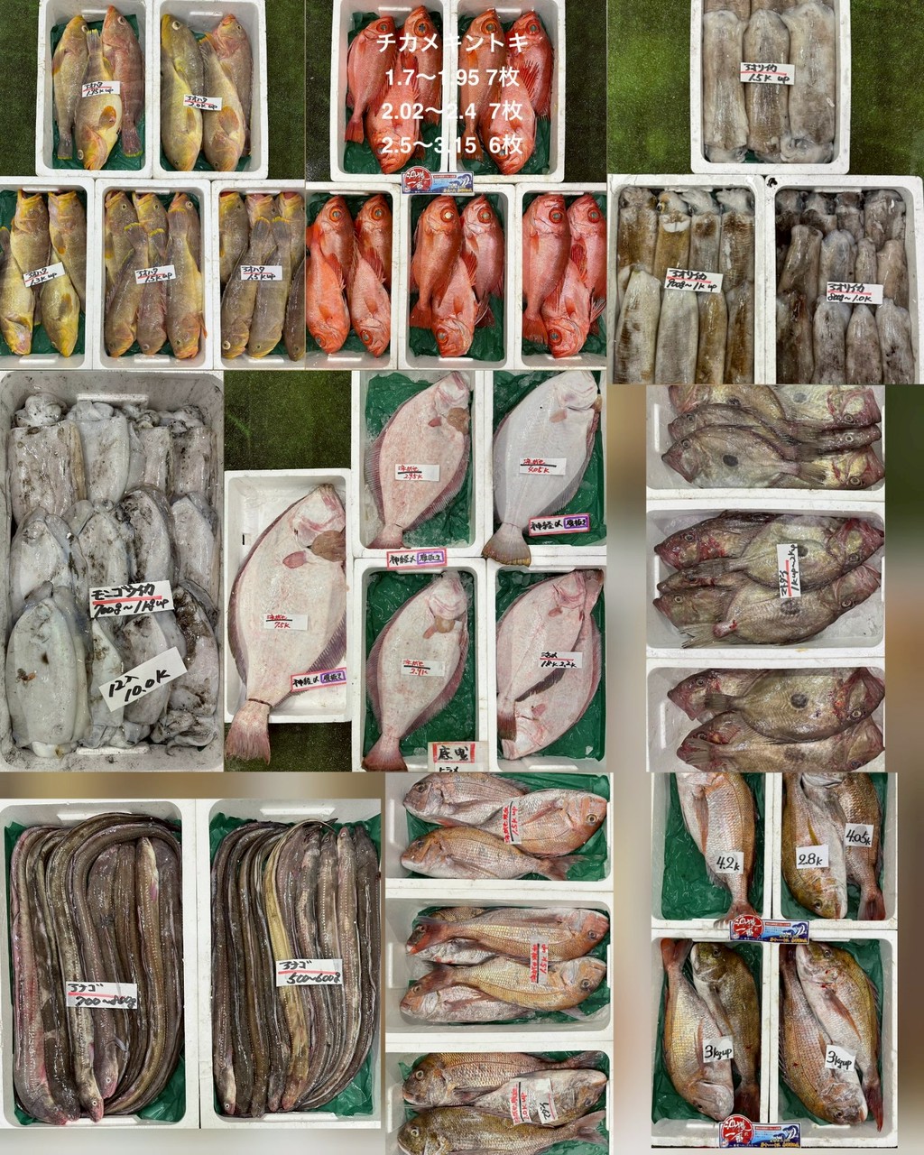 ■底曳チカメキントキ、アオハタ、マハタ(値下)、マナガツオ(値下)、イシダイ、ウッカリカサゴ、マダイ(沖獲れ)、マダイ(泳がせ)、アナゴ、マトダイ、ヒラメ(泳がせ・腹抜き)、モンゴウイカ、アオリイカ