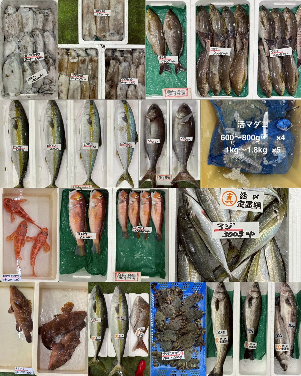 ■底曳マダイ、ヒラメ、チカメキントキ、アオハタ、ウッカリカサゴ、サワラ、マトダイ、アナゴ、アナゴ、アマダイ、トラフグ、モンゴウイカ、アオリイカ、活マダコ